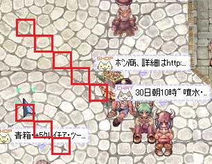毎月第四土曜日はボン帽商店街開催日 月末の土曜日、お暇があればちょっと覗いてみてくださいね。 誰かが集まって、まったりお話しているはずです! 次回開催日は5月24日です。 こちらの概要にも似たようなことを書いてありますが、 頭装備は必ずしもボン帽である必要はありません。 あくまでも「なるべく」揃えられればいいな、という感じです。 (イベント名にボン帽とついているのは、第0回の名残です) また、開催日はよく別の頭装備で列が出来ている場合もあります。(第0回開催参照) なので、「ボン帽は持っていない…」と言う方も、気にせずにご来場ください。 その場で有志の方が売っている場合もあります(笑) Web管理人多忙のためサイト規模縮小計画中・・・ 概要 開催日時 : 毎月第四土曜日 / 22時~24時 開催場所 : プロンテラ中央噴水↑の通路付近 (赤いリボン作成NPC付近) クリックで拡大出店時の注意 1.斜めに列を作る 2.なるべく列で頭装備は揃える (必ず同じでなくてもよいです) 3.新しく列を作る際は看板が被らないようにセルを空ける クリックで拡大こちらの列(第0回開催(?))の再現を考えています。 コンセプトは「月1回のなんかおかしな蚤の市」…そんな感じです。 露店を出している人は在席中の人が多い為、 探し物がある場合も手早い反応が出来るかと思います。 基本的にまったり会話をして過ごしているので、お気楽に足を運んでみてください。 御来場いただき、少しでも楽しめればいいな…と思います。 もし質問等ありましたら、掲示板や、当日在席している方々へどうぞ。 事の始まり 時は2004年8月某日。 プロンテラ街内ワープポイント周辺では、どういうわけか謎の商人の集いが出来ていました。 ![]() しまいには画面にまとまらない位の大人数に。 そんな中、一人の参加者が悪ふざけして出来たのがこのページです。 何故商店街の後に(仮)がついているかというと、兄貴列やサンタ列があったからです(笑 この謎の列、もとい商店街を再びやらないか?という呼びかけをしています。 参加して頂ける方、お待ちしています。 このページの管理人は、ボン帽商店街(仮)主催というわけではありません。 主催はやりたい、続けてみたいと思う人全員だと思います。 このページは、そんな人たちのための情報交換等に使えればと思い、作成しました。 今後続けていくには、まだまだ問題はあるのかもしれません。 それでも、来場者の間で解決し、続けていけたらいいなと思います。 このページにする前のネタ状態即席ページ(作成時間40分) | |||