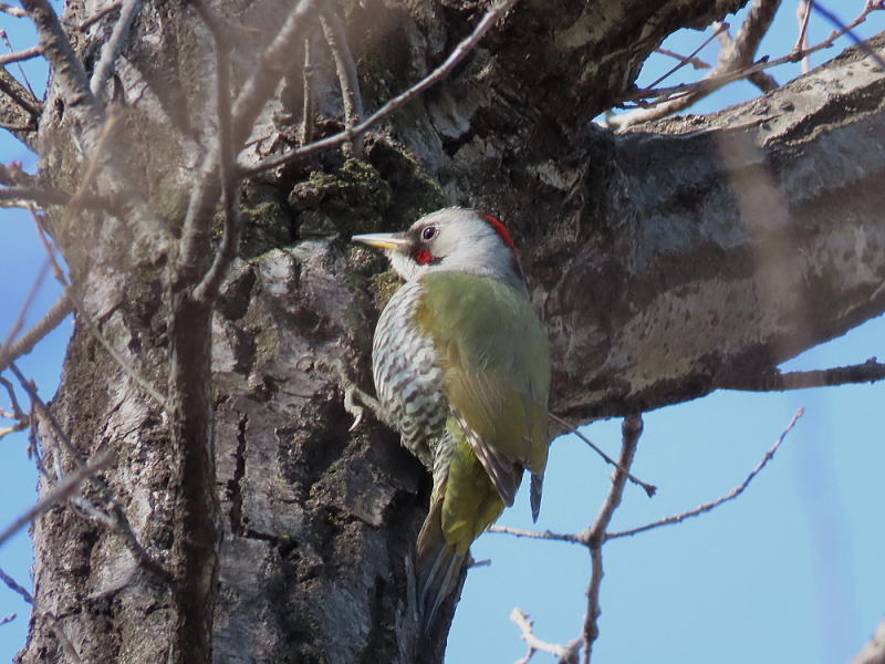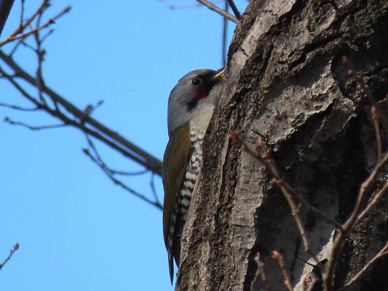 | ボクマダネムイヨ… もう少し冬眠してようと思っていたんだけど、歩きたいとかじゃなくて 運動不足が顕著なマイバディ。 5階の階段を上りきるだけで足がパンパン… これじゃいかんということで、散歩がてら近所の公園を歩くことにした。 家を出る時は気温7度、帰宅時には8度とそれほど暖かくはなかったけど 風が弱かったので寒さは感じられなかった。 公園に向かって歩いていると、頭上でコツコツコツと。 コゲラ? アオゲラ? 近くの木に飛んだので正体がわかった。 |