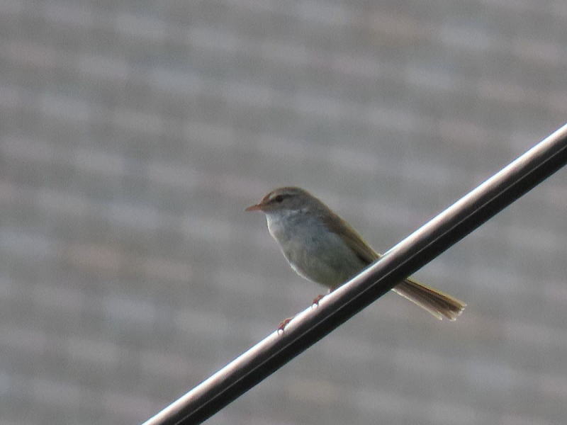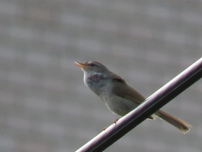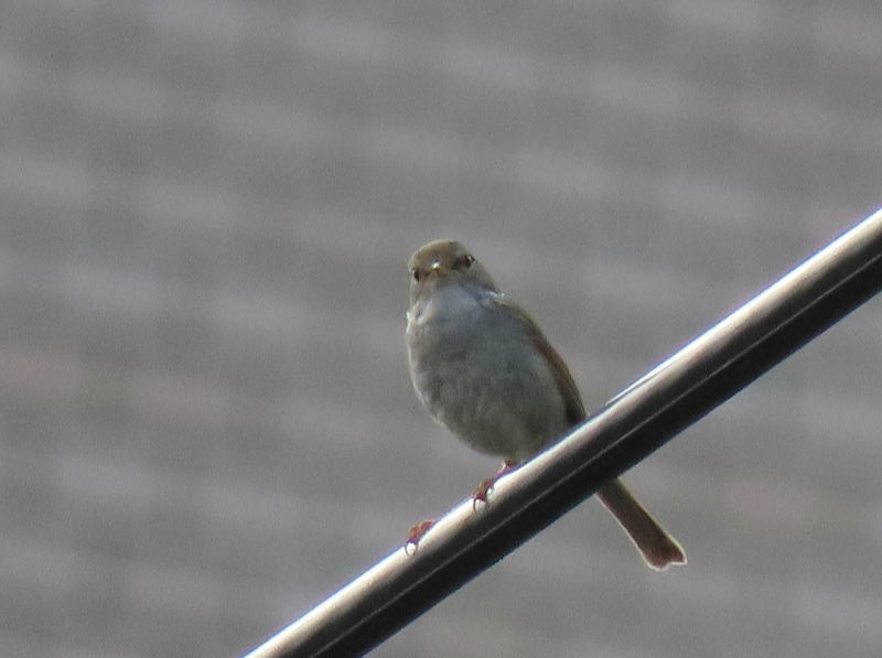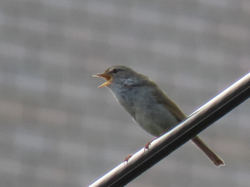 | 最近、我が家付近で毎日ウグイスが囀っている。 今日のお出かけ前、電線で姿が確認できたので、遠かったけど撮ってみた。 |