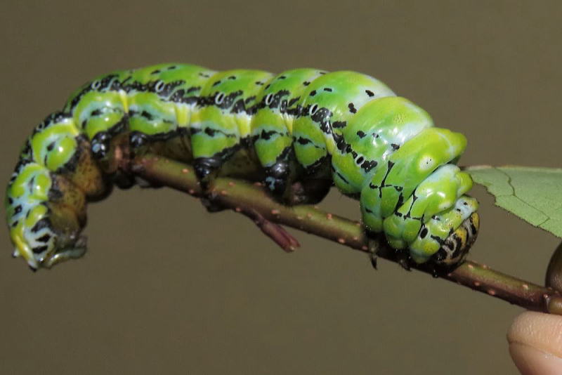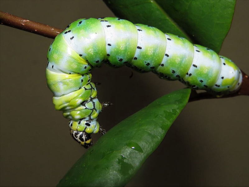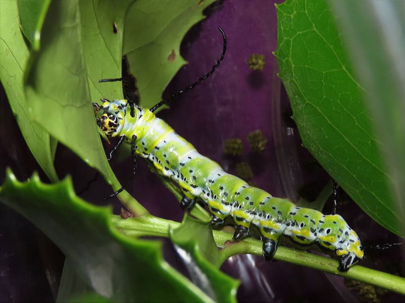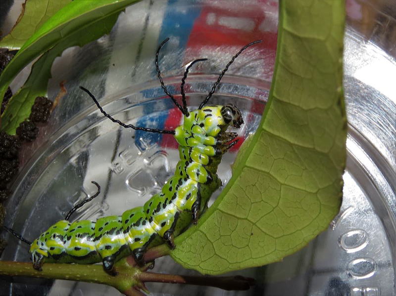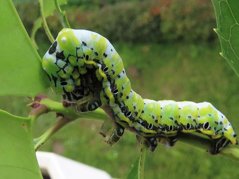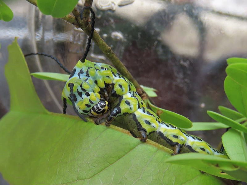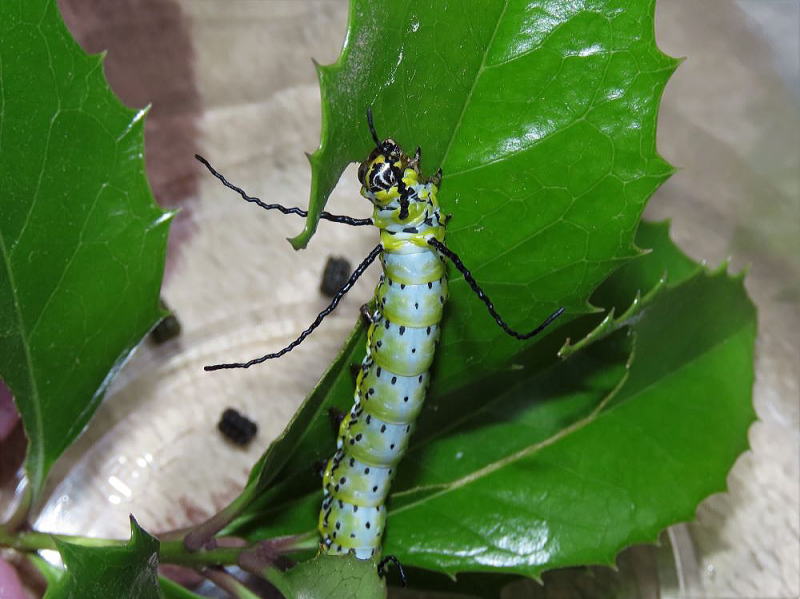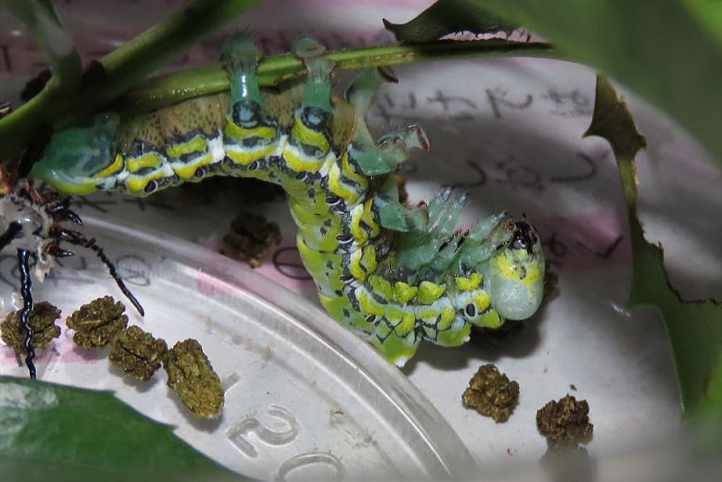もう4齢っぽい。 幼虫での確保は寄生のリスクが高いけど、8年ぶりなので無事にいってほしい。 前回は蛹までいったけど、羽化させられなかったから… 来年、確保場所へ行って、卵を見つけようと考えている。 ところで、我が家近辺にはイボタの木はない。 2012年はキンモクセイでやったけど、落ちる個体がたくさんいたので今回はヒイラギでやってみる。 なつさんがイボタを少し確保してくれたので、イボタ・ヒイラギ・ネズミモチでとりあえず1匹ずつ管理してみようか。 |