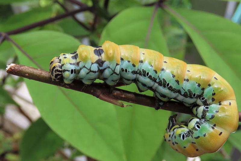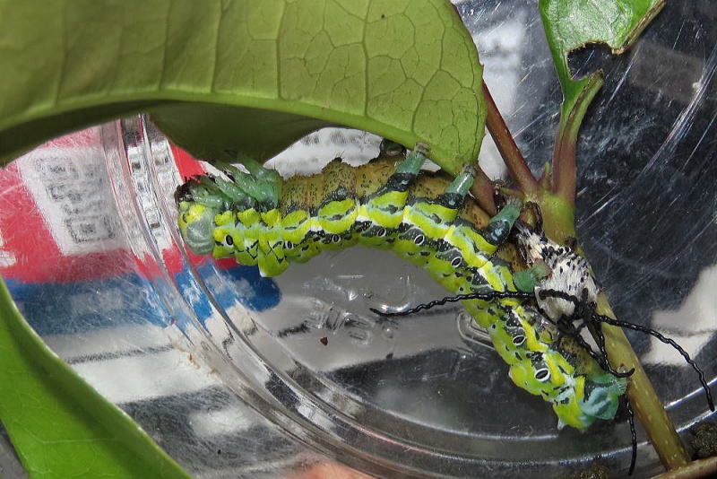 20.5.26 終齢になった途端、1個体が全く食わなくなり、本日落ちた。 原因はさっぱりわからず… なんらかの病気なのかな? 何も出てきていないことから、寄生ではなさそうだけど… 残り2個体となった。 ネズミモチの若い葉を入れたと先日書いたが、もうバリバリ食いまくり。 ヒイラギでやってきた子にも入れたら、ネズミモチの方が好みらしいので 今後はネズミモチをメインでやっていきたい。 葉っぱが柔らかいからか、なくなるスピードがめっちゃ早い。 |
