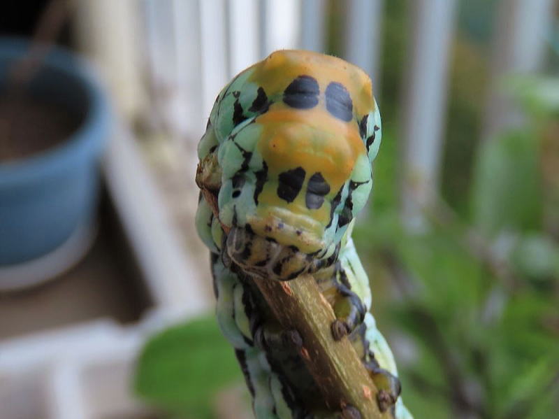20.5.24 昨晩、終齢に脱皮して一時間後には食いまくり。 4齢時にもよく食っていたので、これからはすごいことになることが予想される。 |