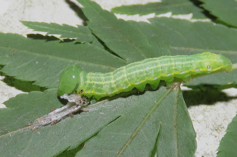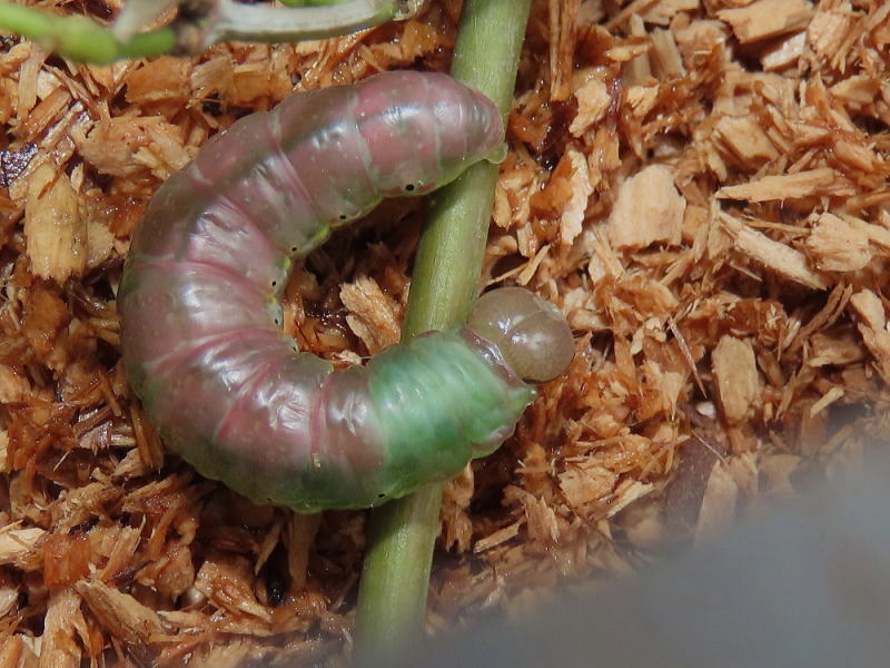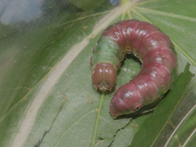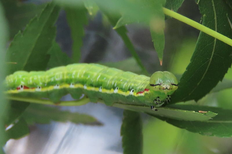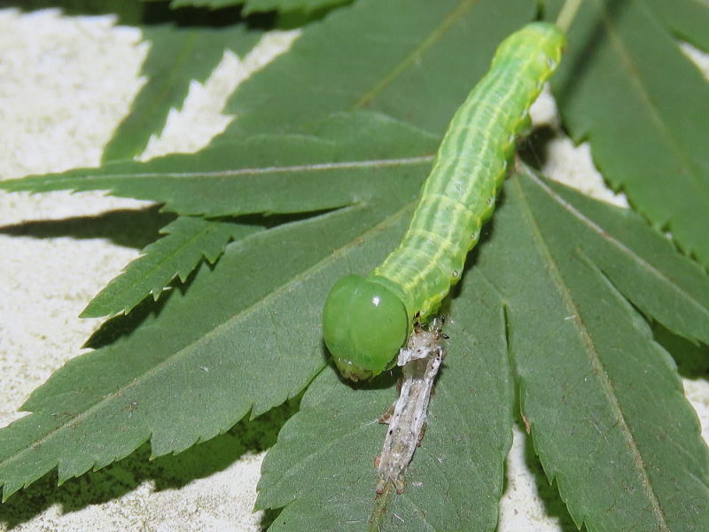 25.9.29 脱皮した? なんかだいぶ変わってるような… 見た目的には、もう終齢に見える。 ワンポイントの赤い筋が目を惹く。 |