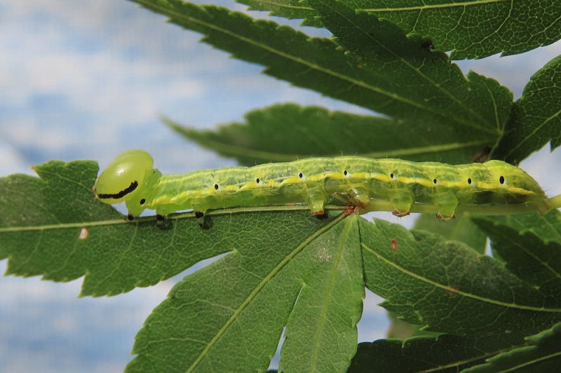 25.9.27 昨晩のmonroeさんとのナイターで、小さめのシャチホコ幼虫がいた。 カエデシャチホコとのことで、成虫もあんまり見ないので持ち帰ることに。 ちょうど4齢に脱皮したところのようだ。 |