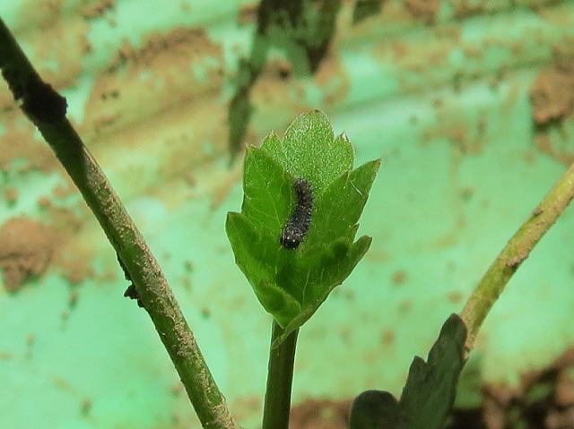12.5.15 ベランダ管理継続中、いつも同じ葉にいる。 少しずつ食っているのがわかる。 ここまでは順調だ。 |