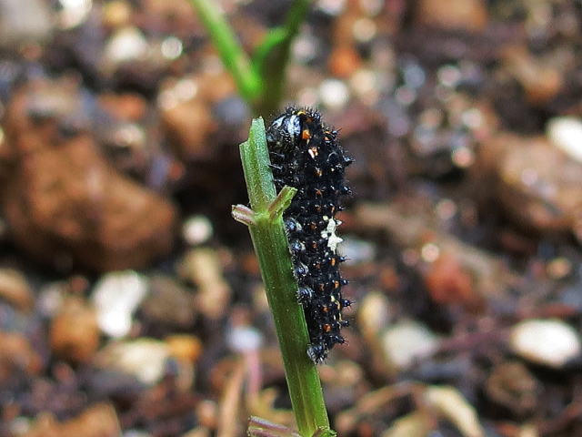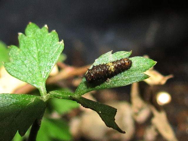 12.5.20 体が一気に大きくなった気がする。 約10o。 画像は本日午後に撮影。 若齢のアゲハ系幼虫らしく、アグレッシブな体付き(個人的感覚)になってきた。 2枚目は、幼虫に当たらないよう土に霧吹きしたつもりが若干当たったのか威嚇モードに… 夜になると、脱皮の準備か固まっている。 明日3齢になっているかもしれない。 |
