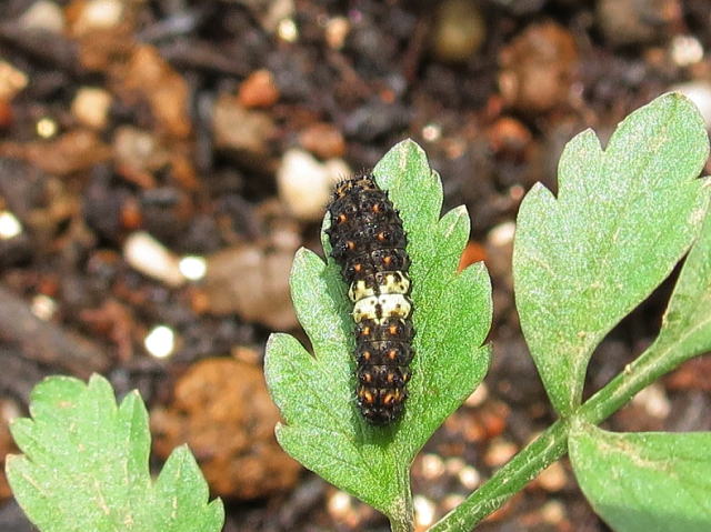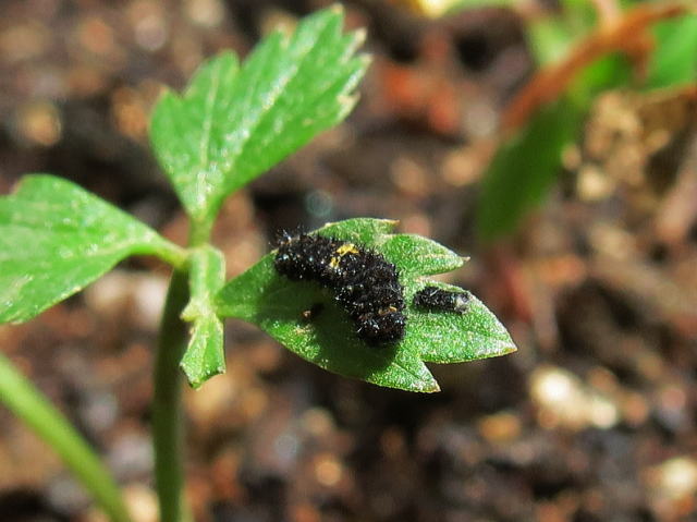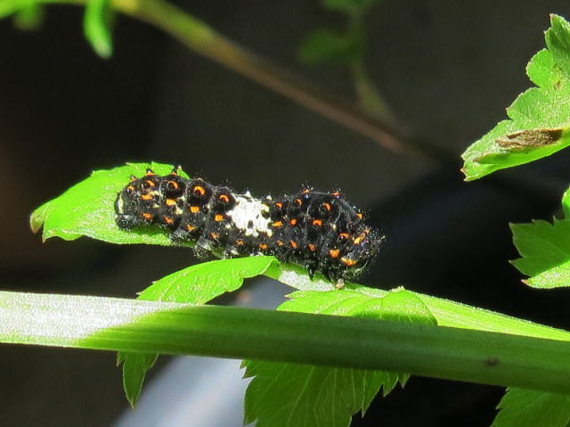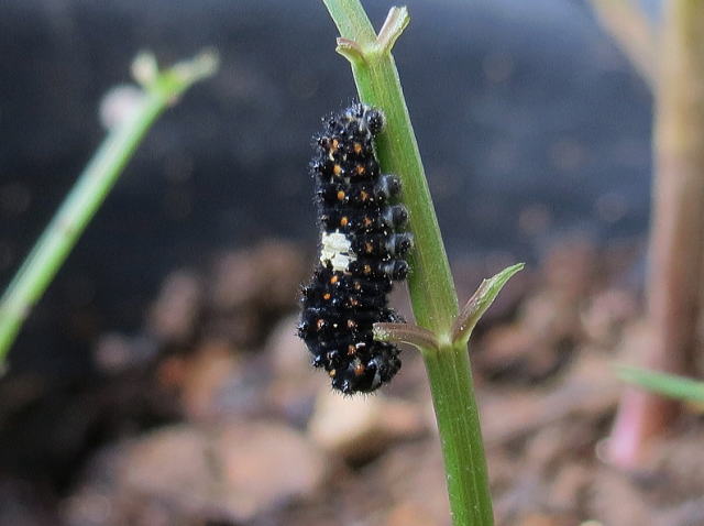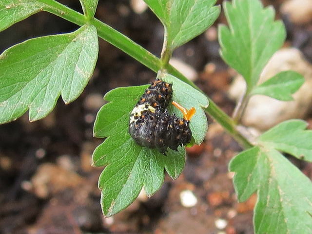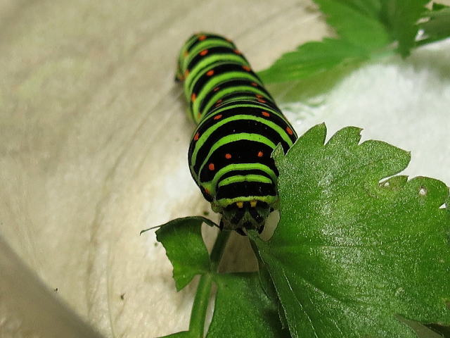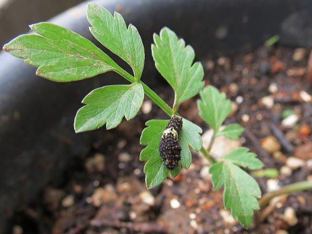 ポットに植えてあるセリの一番若そうな葉に移動。 ずっと同じ位置でおとなしくしていた。 しばらくはベランダにてこのまま放置し、脱皮したらポットごと室内で管理しようと思う。 |