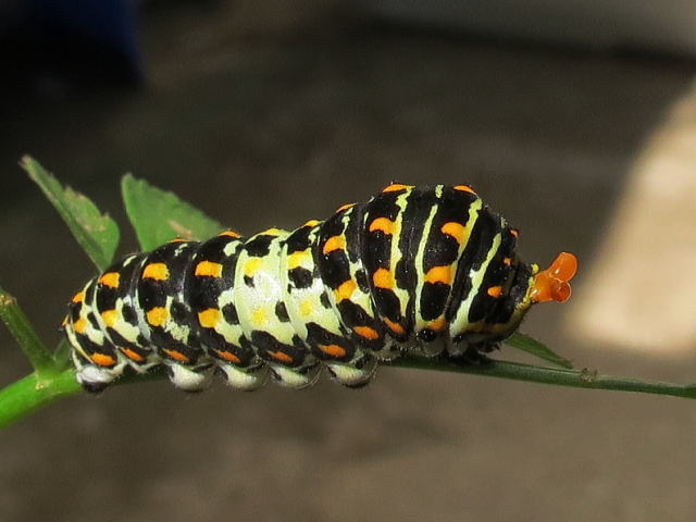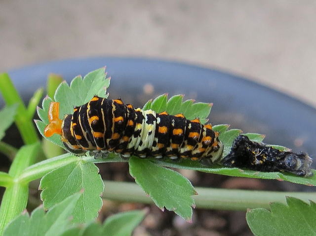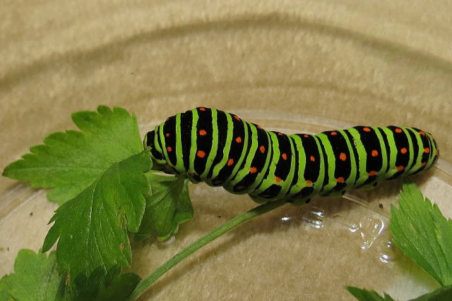 12.5.30 本日未明、終齢に脱皮していた。これぞキアゲハの幼虫という容姿になった。 前回の事件から、室内で容器に入れて管理している。 多めにセリをとってくればなんとかなりそうなので、その方向で考え中。 |