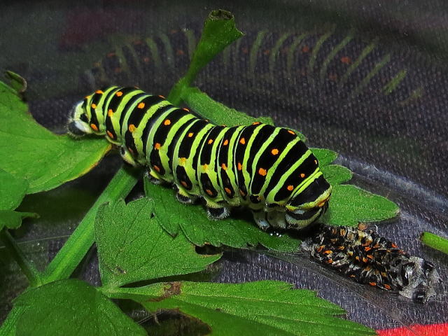 12.5.22 昨日脱皮したように思えるけど… とりあえず3齢に。 食草が小さい葉っぱなのですぐに食い尽くす。 知り合いの農家にニンジンの葉(無農薬栽培)を依頼しているので、来週辺り切り替えるかもしれない。 昨日から寄生バエっぽいのがちょろちょろ見えるので、基本室内管理に切り替えて、 在宅時にベランダへ数時間出している。 |