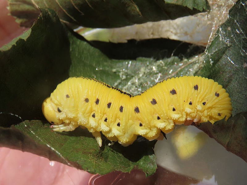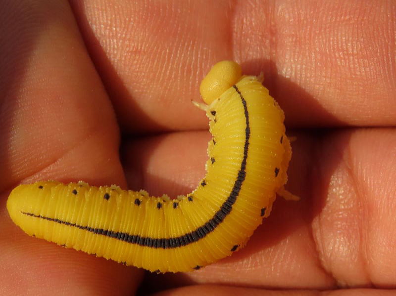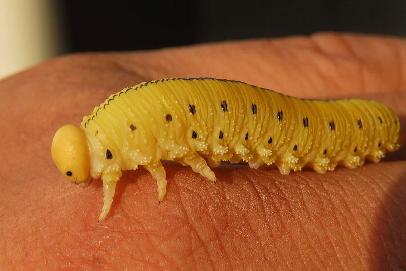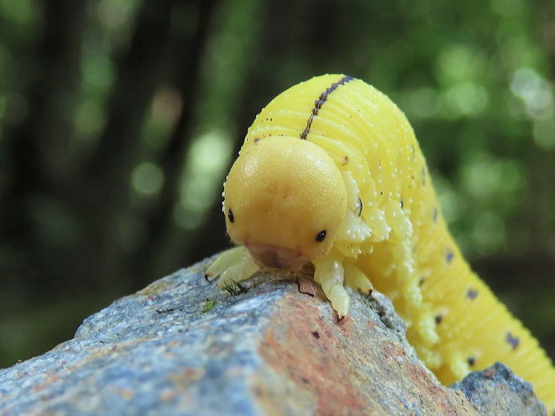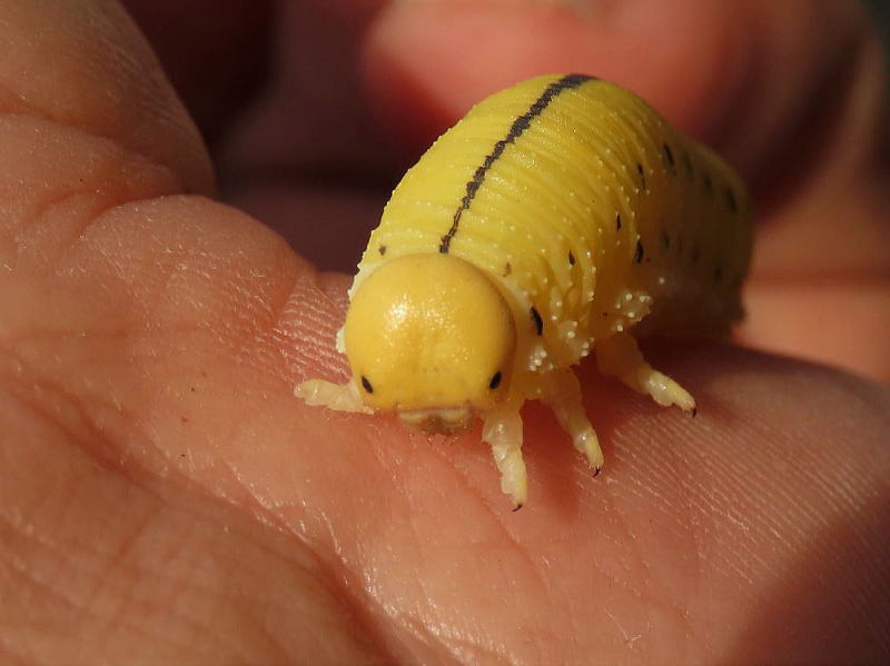 20.8.24 本日の散策で、山道の上にいる黄色い大きな幼虫を発見。 数匹のアリにいじめられていて、可哀想なので救助した。 |