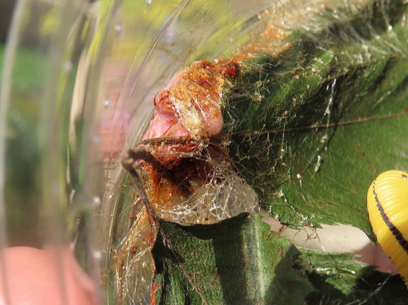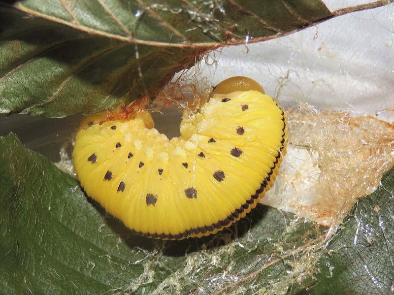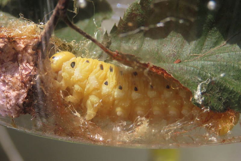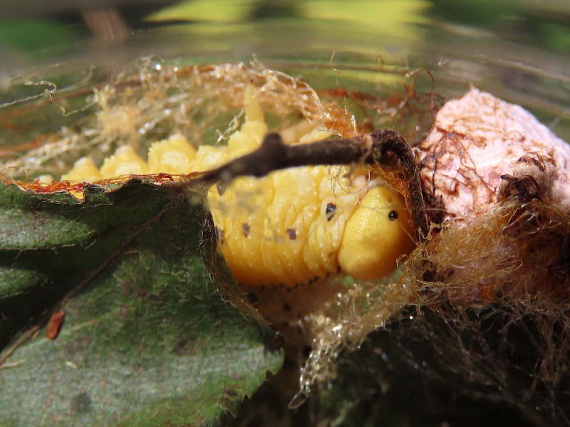 20.8.28 葉っぱにも糸を掛けていて、剥がすのはまだ可哀想なのでそのままにした。 二枚目はケースの外から撮影。 少し縮こまってきて、数日中に蛹化しそうだ。 |