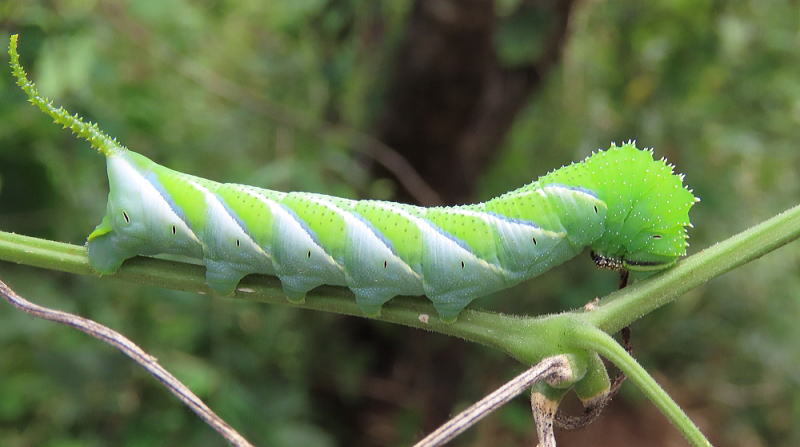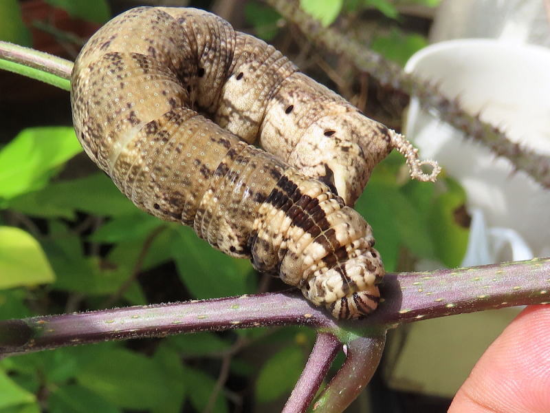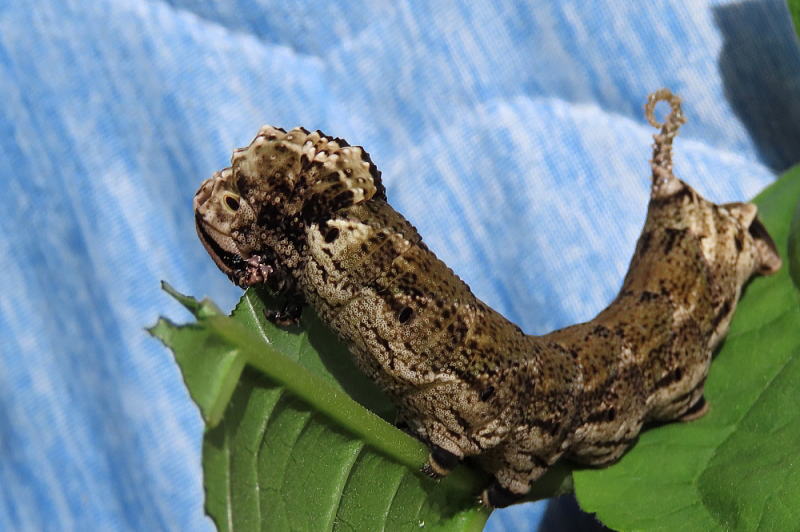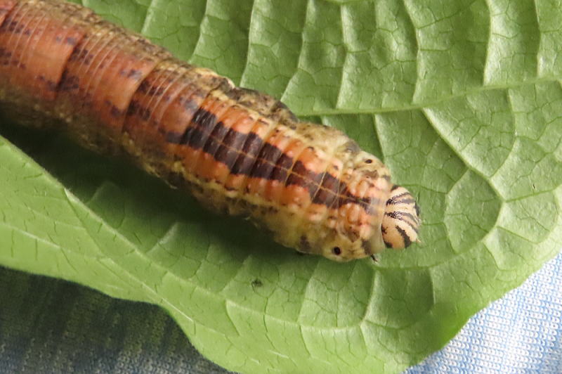 25.9.22 今日の散策で、蔓性植物にクロメンガタスズメの幼虫がいるのを発見。 そばにクサギがあったので、休憩していたんだろうか。 できれば卵からやってみたいんだけど、なかなか見つけられないのでお持ち帰りした。 すでに4齢になっているので、観察期間はそう長くない。 昨年は2齢での確保だったけど、羽化に至らなかったので、今回は羽化させることを目標にする。 |