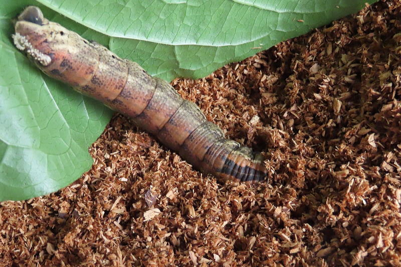25.10.1 今朝、確認すると歩いていた。 赤っぽく変色していて、蛹化態勢に入ったようだ。 マットを用意したら、すぐに潜り始めた。 |