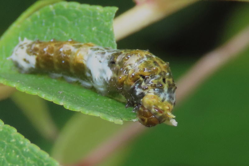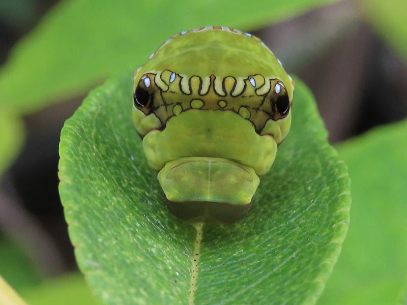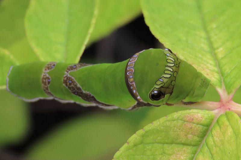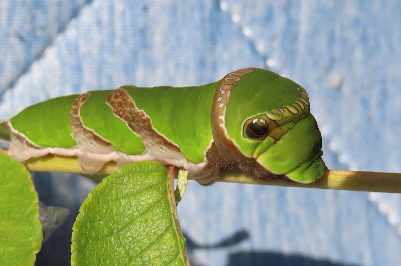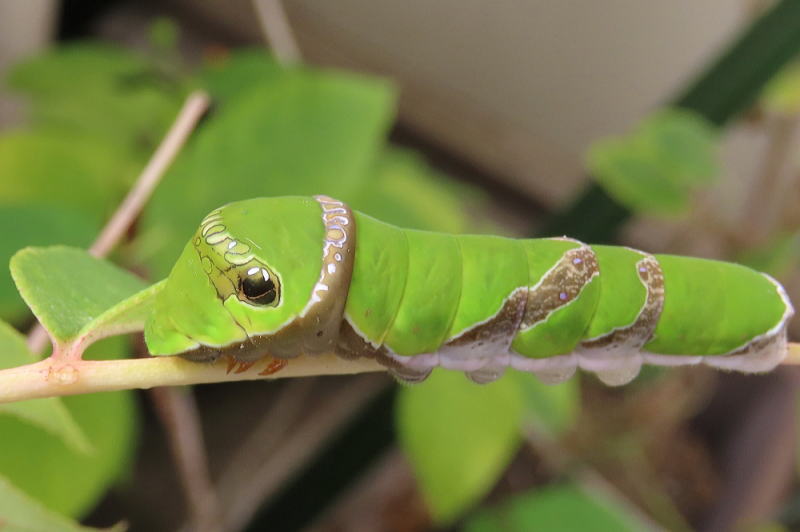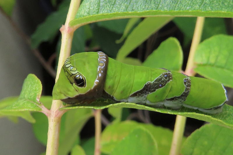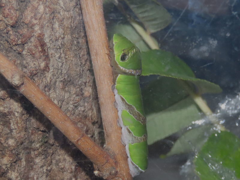 | 25.10.6 昨日は一日用事があったので、全く観察しなかったけど 日数的にも頭の大きさからも、3齢になっていると思われる。 今日見た時、おっ立っていたので、どしたどした!?って感じ。 寄生蜂とかが寄ってきたのか?と思ったけど、姿は見られなかったので大丈夫か? その後は二枚目のように落ち着いた。 |