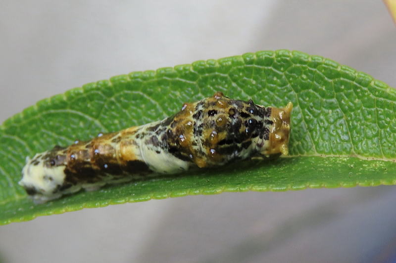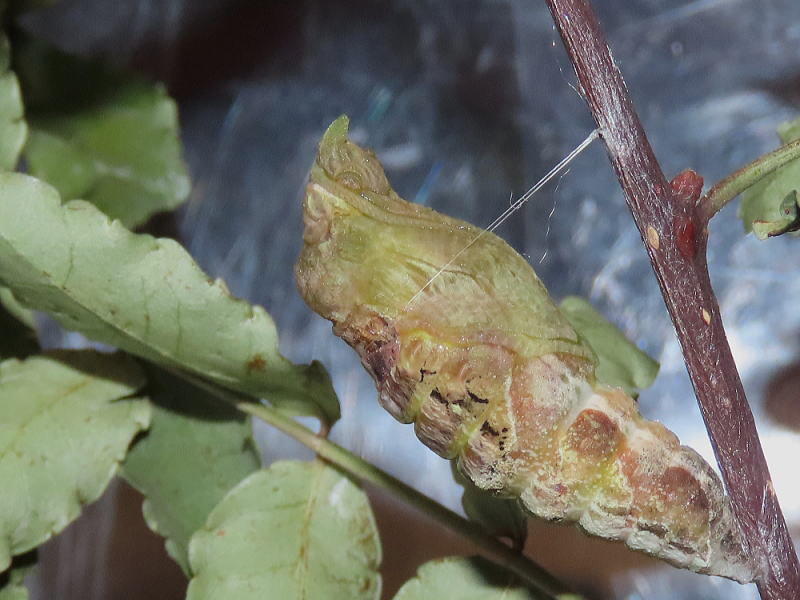 | 25.11.7 本日遅くから明日にかけて蛹化するだろう。 モンキアゲハにしてはだいぶ小さい。 ナミアゲハくらいのサイズで羽化するのではないか? ともあれ、無事にいってくれたらそれでいい。 |