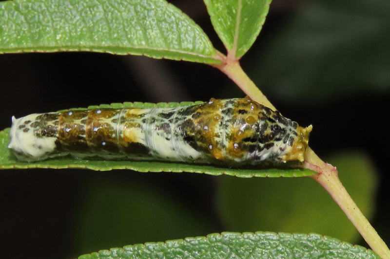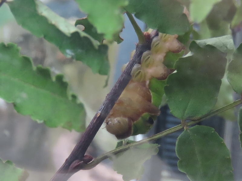 | ありゃ、蛹化態勢に入ったか? 木の棒をそばへ置き、そこに移ってもらって確保しようとしたけど、微動だにしなくなった。 ちょくちょく確認しながら時間が経過し、0時過ぎにようやく動き始めたが、葉っぱに戻っていっている。 もう脱走など危ないので、ゆ〜っくりひっぺ剥がして確保し、蛹化ルームへ移動させた。 バタバタしちゃったので撮影を忘れ、スタンバってからケースの外から撮った。 |