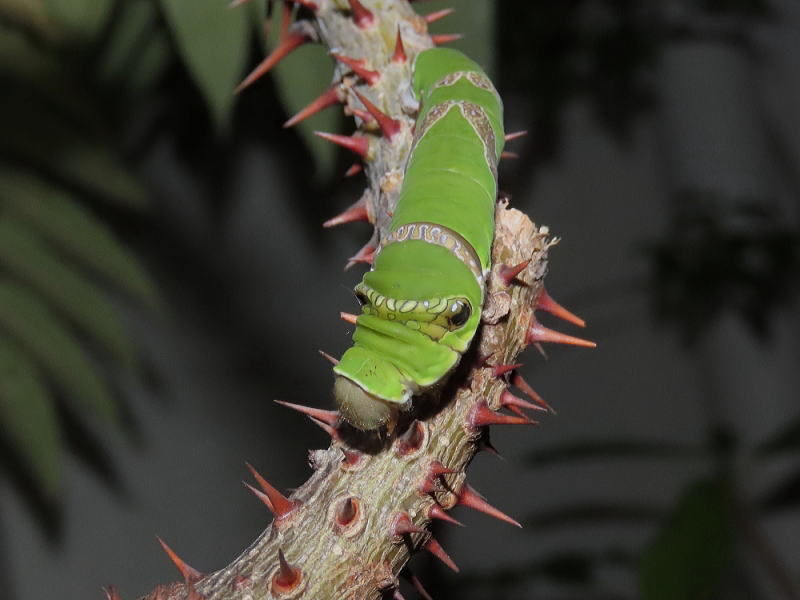 | 25.10.28 大きさから、まだ蛹化態勢に入らないだろうと思い、明日辺りに収容しようと考えていた。 しかし、もしかしたら今晩どこかへ行っちゃう可能性もあるので、30分おき位にチェックしていた。 23時に見てみると、びっしりトゲトゲの樹を歩いていた。 |