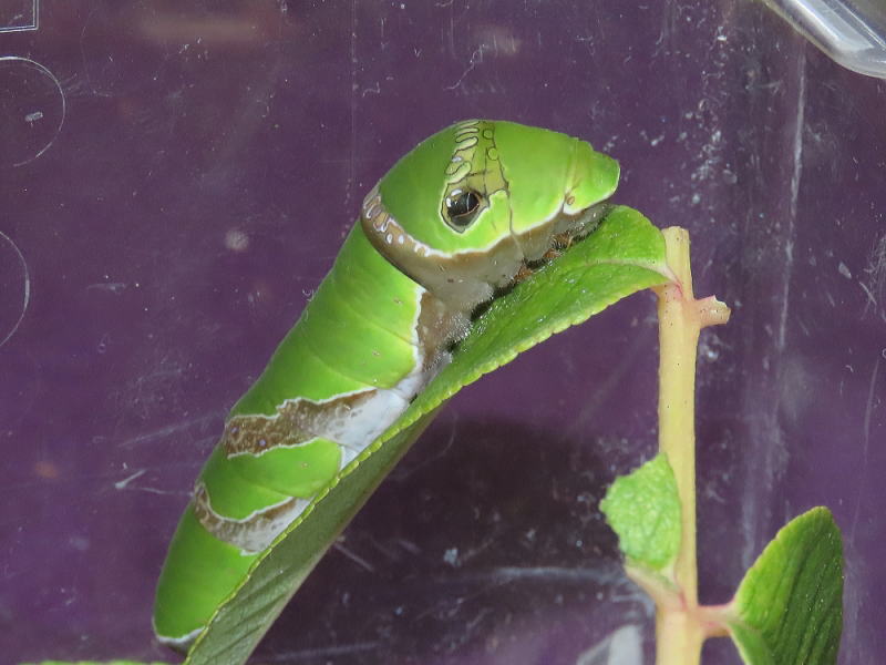 | 25.10.19 昨晩はまだ脱皮前だったけど、今朝見たら終齢になっていた。 ここまでは順調にきている。 |