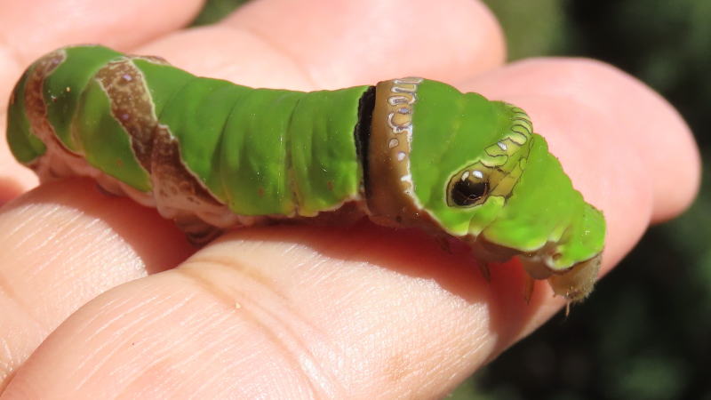 | 25.11.3 終齢になって半月、まだ変化はない。 夜は寒くなってきているため、成長が遅くなっているのか? モンキアゲハにしてはまだ小さめなので、もう少しかかるかもしれない。 葉っぱ交換の際に手乗せして撮影。 |