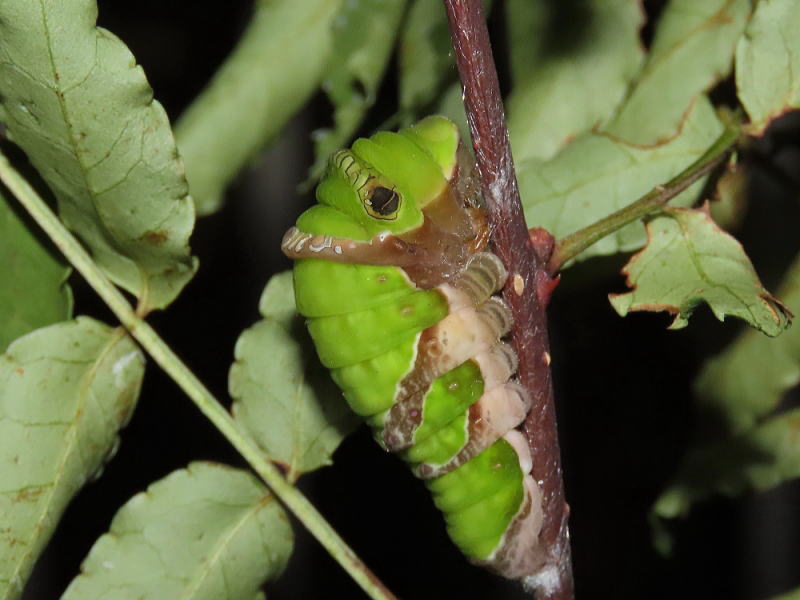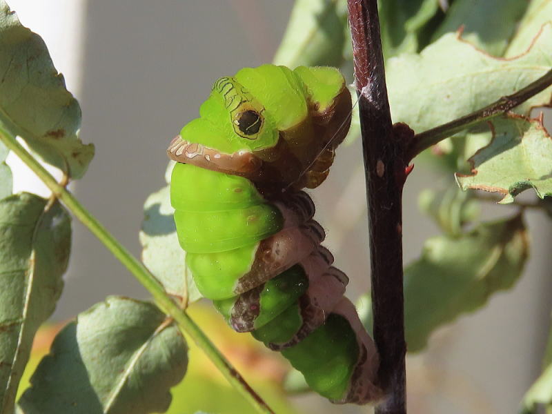 | 25.10.3 アゲハの達人ことPapilioさんに確認していただいた。 この色で修正している通り、まだ2齢だった。 気温が少し落ち着いてきた(特に夜は涼しい)ので、成長が夏よりも緩やかなようだ。 モンキアゲハは、クロアゲハと比べてより若い葉を好むようで、それも影響しているかもとのこと。 順調にきているのは間違いない。 今日は真横から。 |