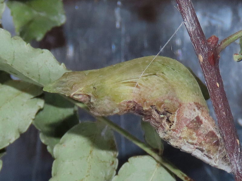 | 25.11.6 カラスザンショウは尽きそうなので、一昨日から普通のサンショウを入れている。 本日様子を見ると、足場に糸をかけているように見えるので、蛹化準備に入ったか? 邪魔しちゃいけないので、ケース外からの撮影にした。 |