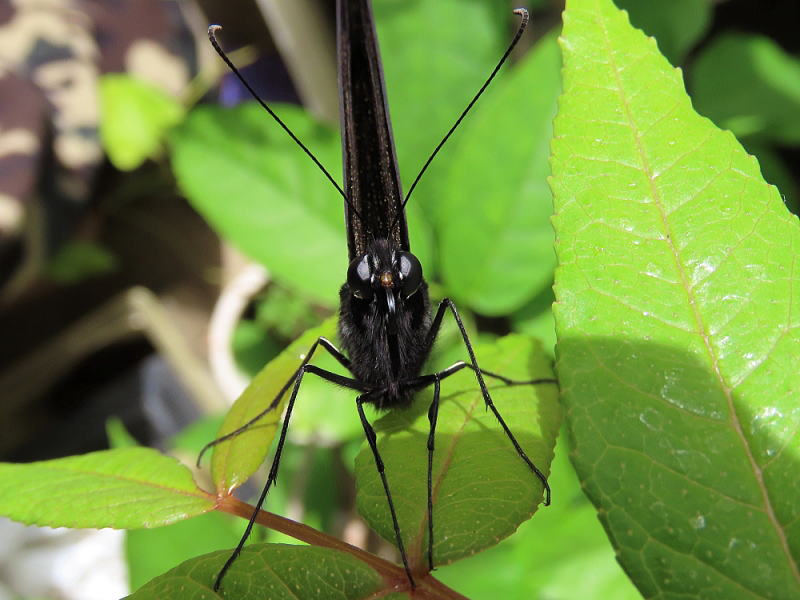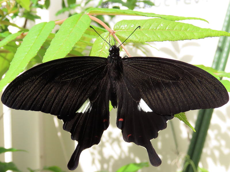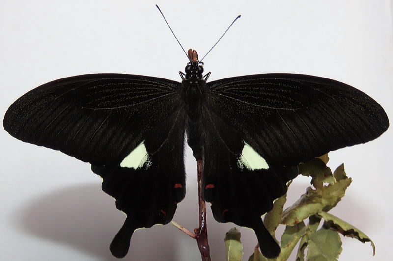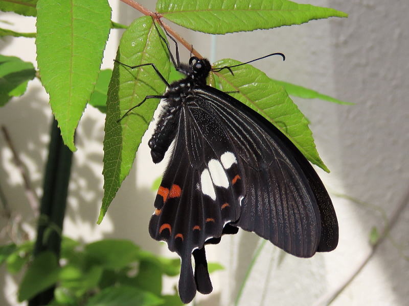 | モンキアゲハとしては通常よりもちょっと小さめと感じるので、定規を当ててみると4センチ弱くらい? この当て方だとわかりづらいかな? ついでに、晴れているので日向で三方向から撮っておいた。 |