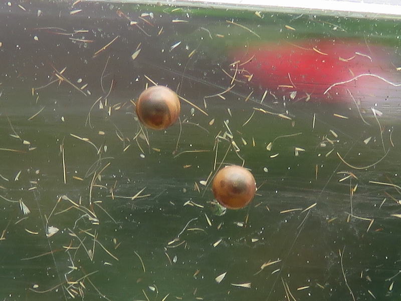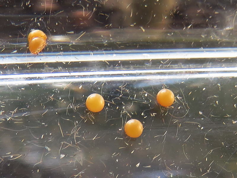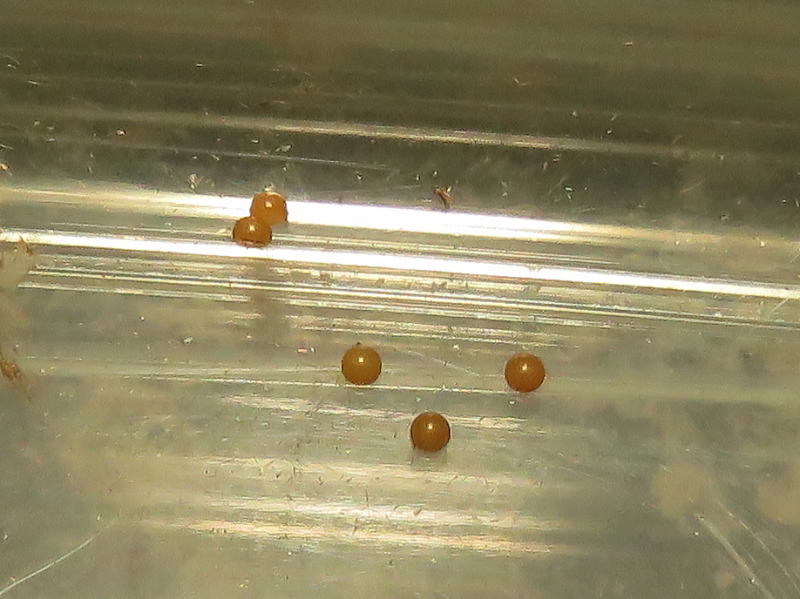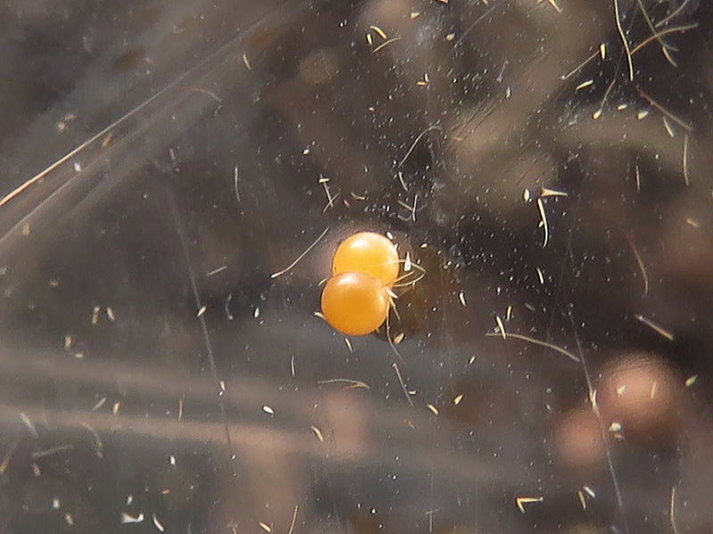 家を出る時にはおとなしかったけど、移動中に暴れていたのは知っていた。 到着して見るとたくさん無精卵を産んでしまったので、撮影後ここへリリースすることにした。 自然界では羽化してすぐに♂と出会い、すぐに産卵するんだろうね。 |