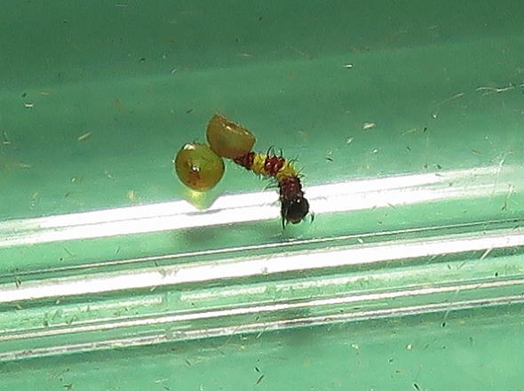この子は、お尻が引っかかっていたようで、しばらくこのままだったので手助けした。 数十分経ってもそばの葉っぱへ移らないので、葉の上に移動させたら落ち着いたようだ。 ったく、世話が焼けるな… 朝確認すると、もう1個体孵化していた。 昼になると、両個体とも葉を食べている。 あと4つは出そうなので、楽しみに待っているのだが、夜の時点でまだ孵化はなし。 以前も孵化率が悪いと感じていたので、最悪この2個体だけになりそうか? もう少し産ませておけばよかったかも… |