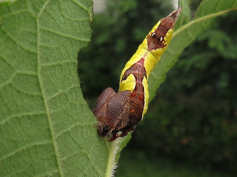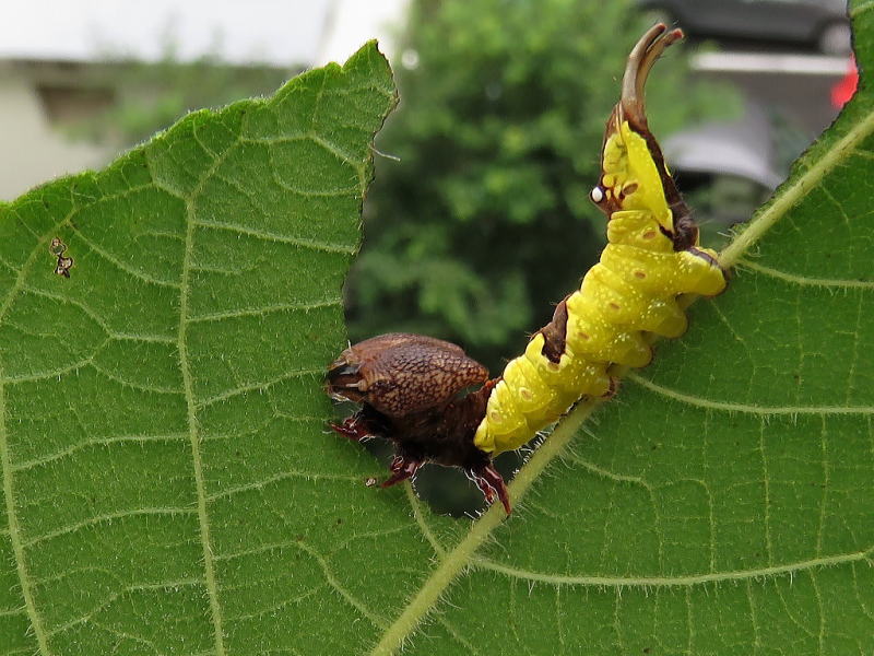 17.9.6 2号はなぜか小さかったけど、やはり異常が起こっていたようだ。 昨日とかほとんど食っていなかったので心配していたけど、本日落ちているのを確認。 どうもムラサキシャチホコは、孵化率が悪かったり生存率が良くなかったりのイメージ。 1号は順調に成長している。 見れば食っているといった印象。 今日も葉っぱを持っての撮影だったけど、全く気にせず食い続けていた。 |