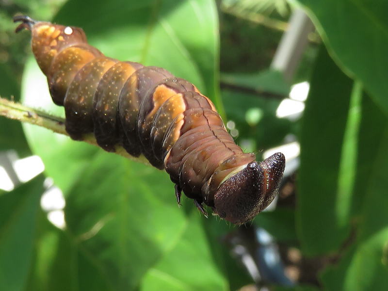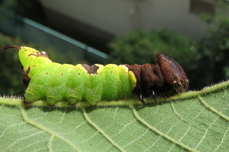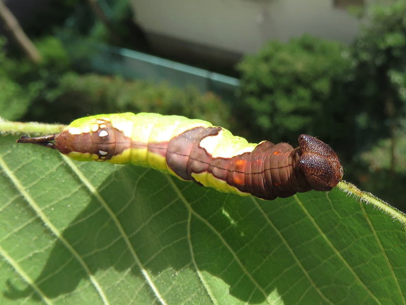 17.9.9 だいぶプックリしてきた。 葉っぱの減りが早い。 でかくなったので、そろそろ蛹化態勢に入るだろう。 |