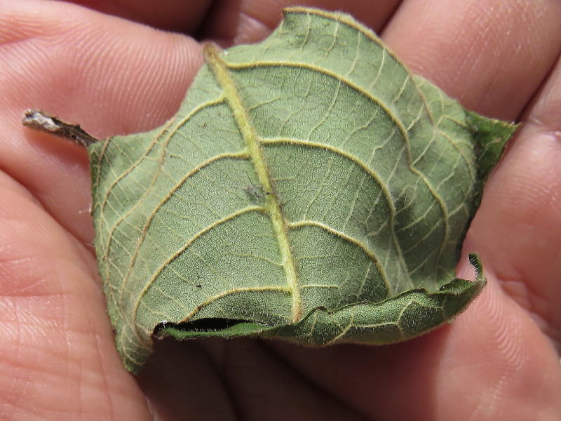 17.9.15 オニグルミの葉をいくつか小さめに切って入れておいたら、上手に綴って蛹化してくれた。 おそらく蛹化から2日ほど経っていると思われる。 ほとんど隙間なく作ったのだが、撮影のために壊させていただいた。 |