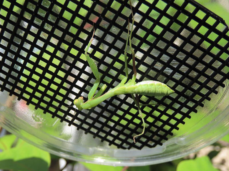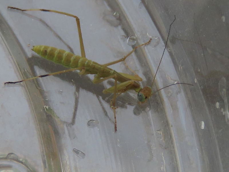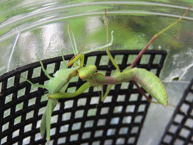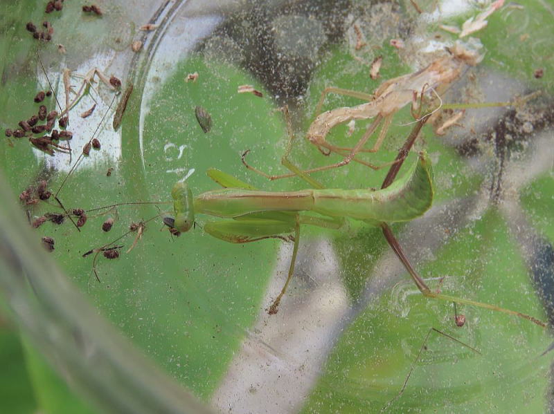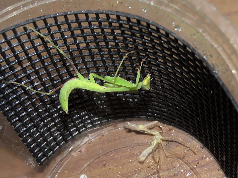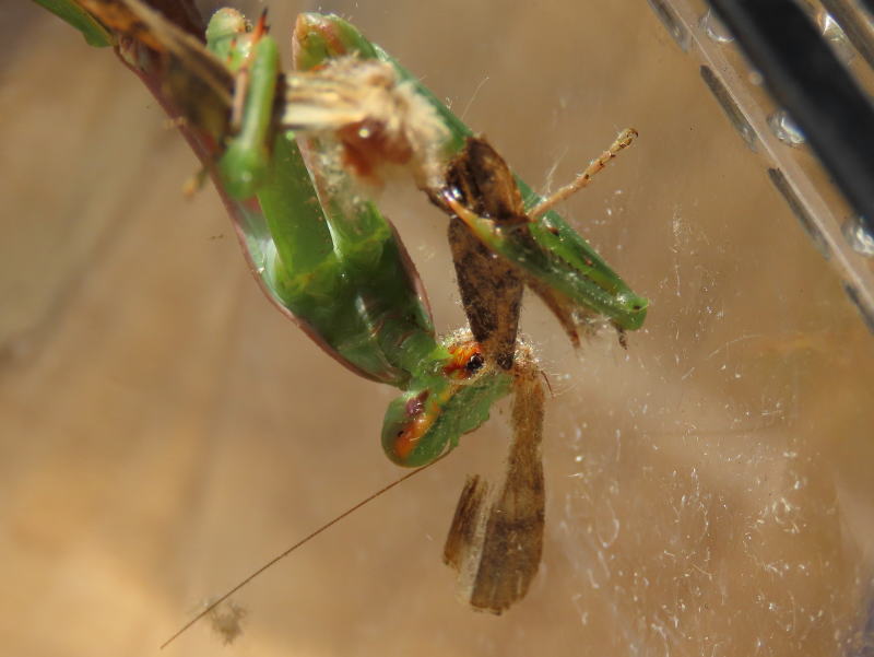 23.7.31 24日、脱皮していたけど、後脚が脱皮失敗… 難しいね、カマキリの飼育は。 流水で皮は脱げたけど、左後脚はバカになっちゃってる。 この脚では次の脱皮はうまくいかないだろうけど 最後の1個体だし、もう少し観察を続けることにした。 後脚以外は全く問題なく、エサはちゃんととれている。 |