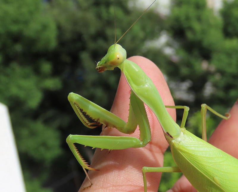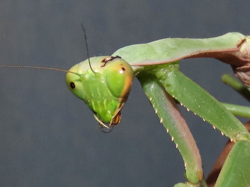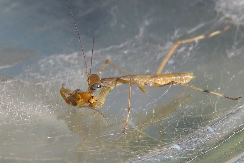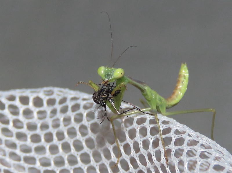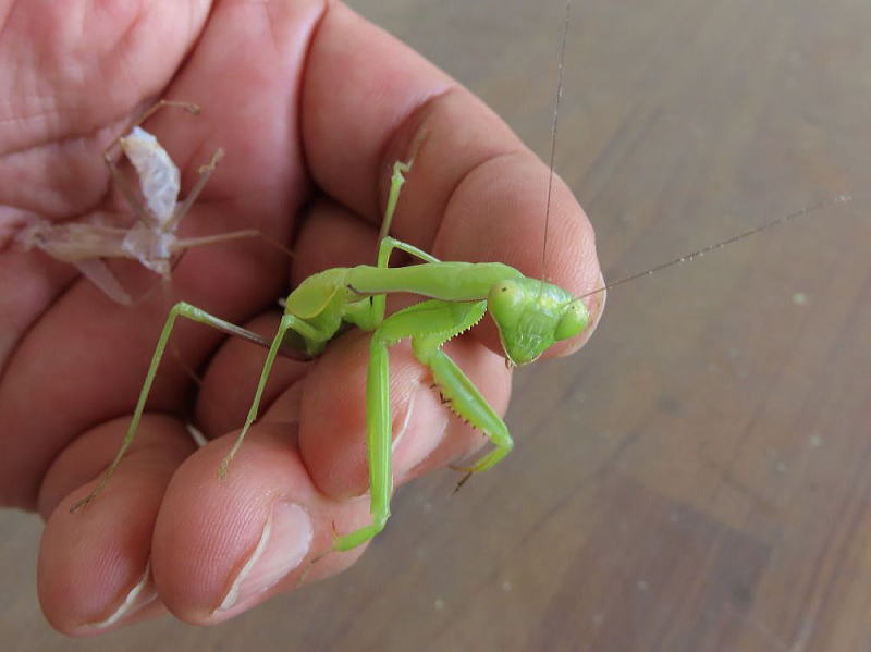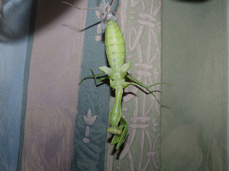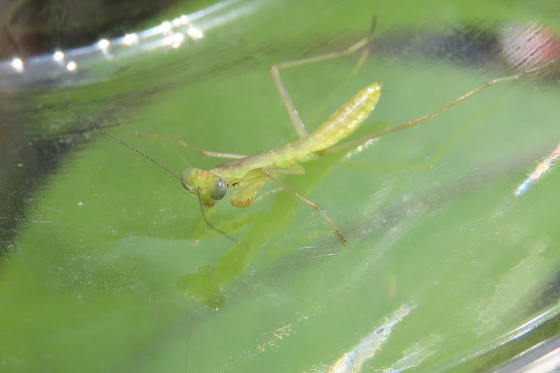 23.7.31 24日、脱皮していたけど、後脚が脱皮失敗… 難しいね、カマキリの飼育は。 流水で皮は脱げたけど、左後脚はバカになっちゃってる。 この脚では次の脱皮はうまくいかないだろうけど 最後の1個体だし、もう少し観察を続けることにした。 後脚以外は全く問題なく、エサはちゃんととれている。 |