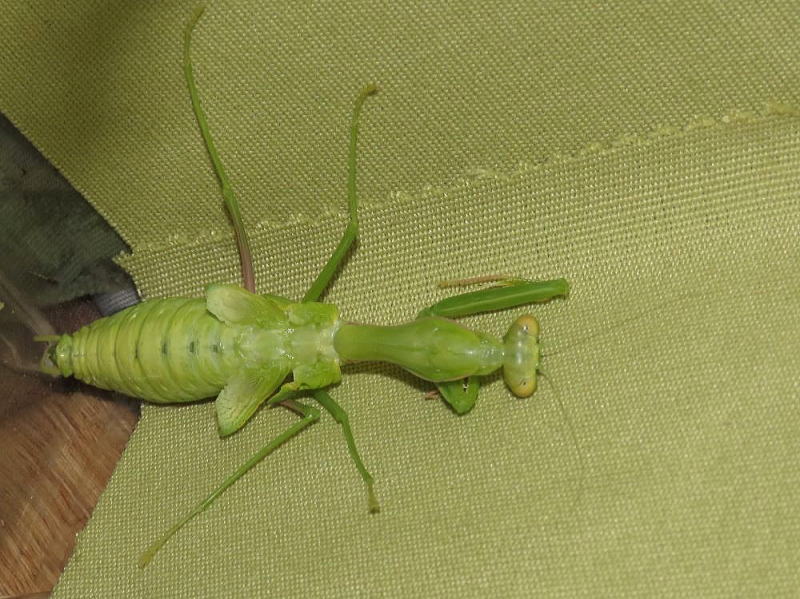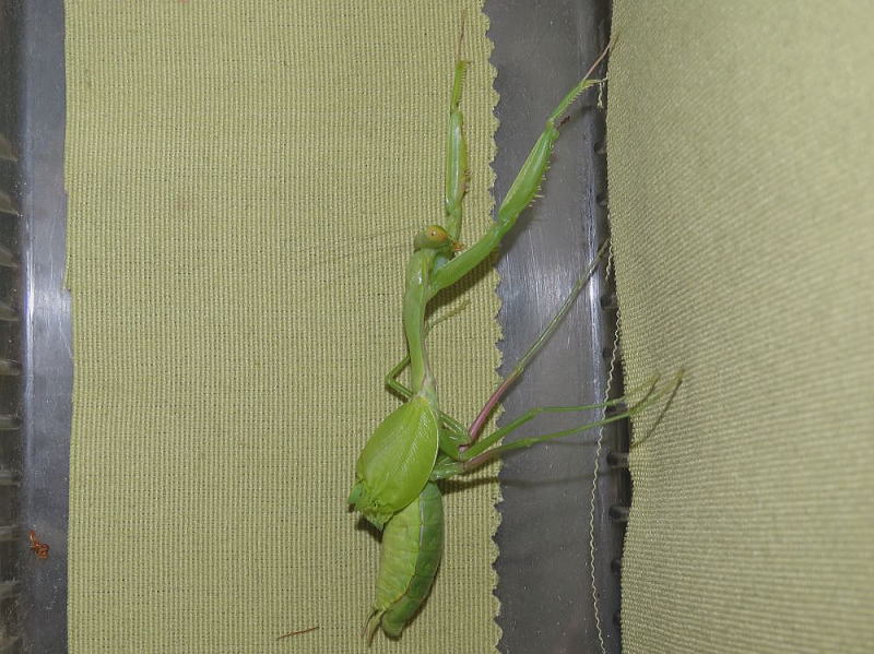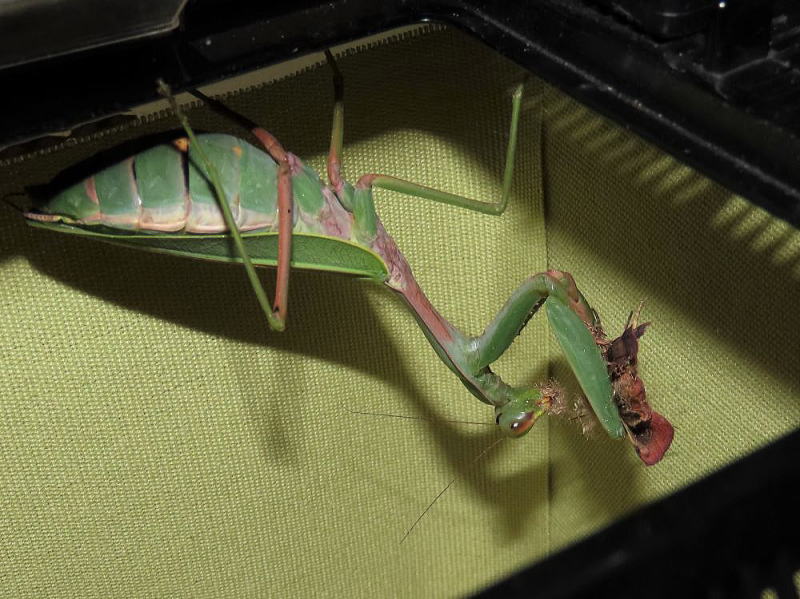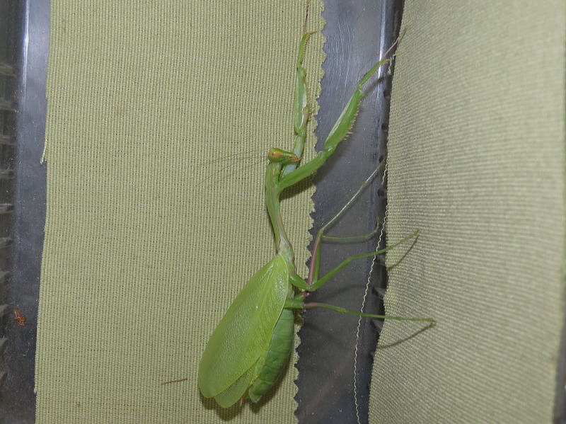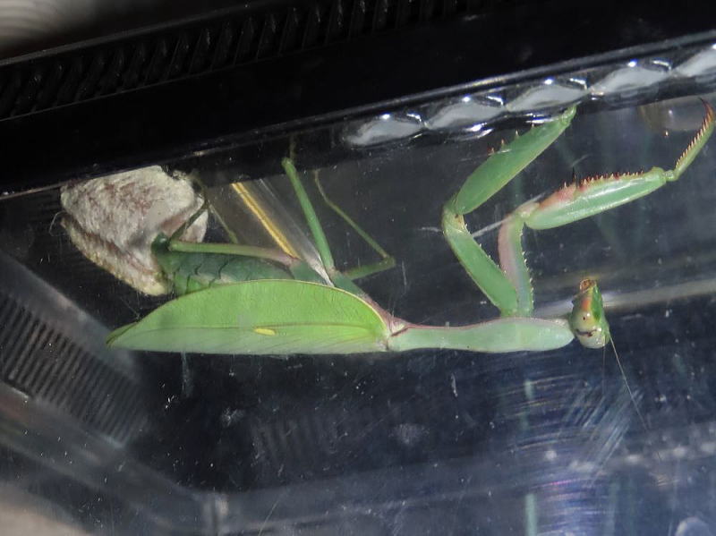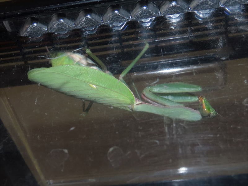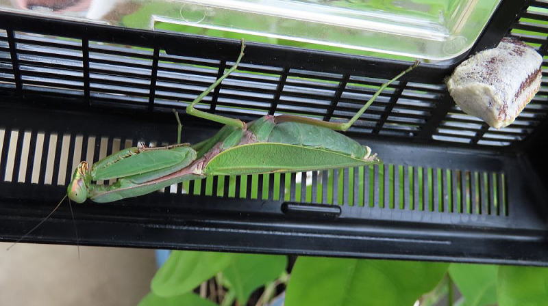 22.10.9 食欲は旺盛で、蛾を中心にバッタなどもたまに与えている。 昨日から、上のケース蓋をちょくちょく歩き回る。 コーリングはしておらず、産卵行動もまだ見せていない。 狭いケース内でのストレスが原因かもしれない。 そんなことから、本日はかなり長めに部屋内を散歩させた。 変化が出てくるのは、もう数日経ってからかな。 |