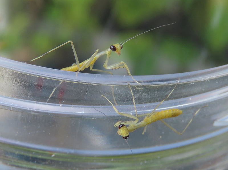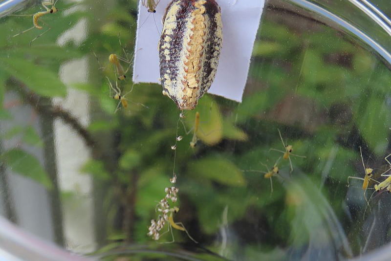 23.5.22 本日、孵化しているのを確認。 午前の段階で、40くらいが出てきていた。 今年はイモムシ観察が多忙のため、ちょっとカマキリ観察のテンションが上がってきていなかったり… 一応6個体を個別ケースに確保したけど、今後3つくらいで面倒を見ていくかも。 エサ確保の際に、カマキリが挟まって…という事故が過去に何度かあったのでリスキーではあるけど。 ほぼ確実に外来種という判定となっているため、捕獲現場にリリースするかは慎重に判断したい。 |