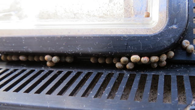 2時間半後に産んだかなと見てみると… おい! やり過ぎだろ! 70個ちょっと産みやがった(苦笑) 画像は明日にでも撮影しよう。 地元産なので5つほど観察飼育するとして、残り多数はよく外灯に飛んでいる付近にリリース予定。 |