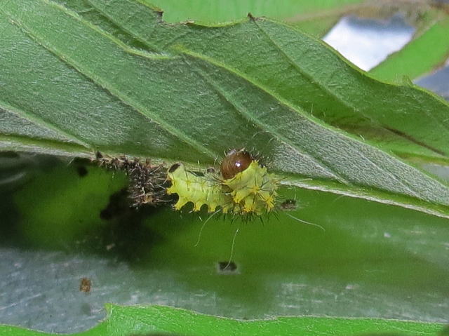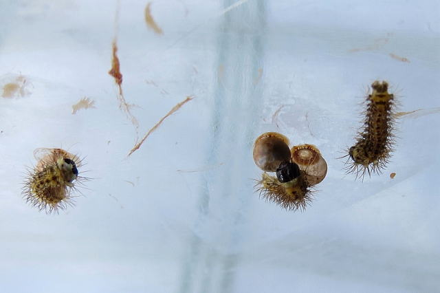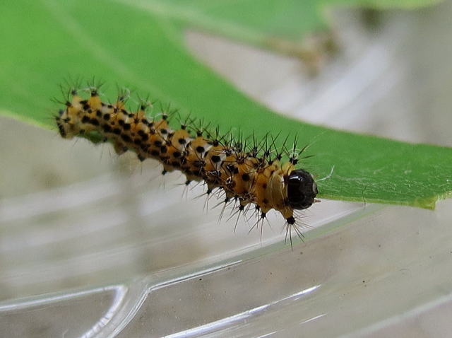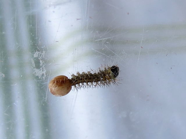 全個体をチェックしていたら、脱皮直後の個体がいた。 ん? 緑色になってる… ということは、3齢なのかな? ←まだ2齢でした |