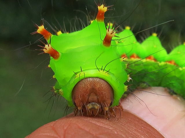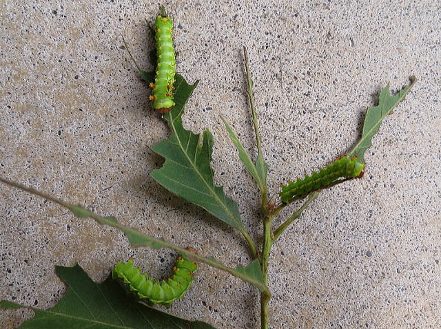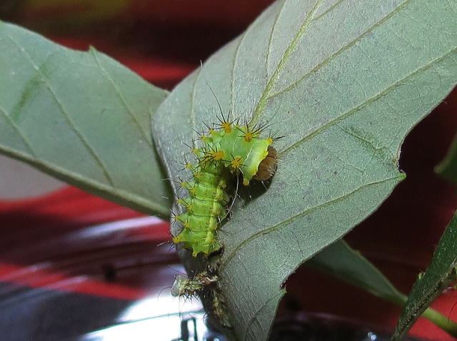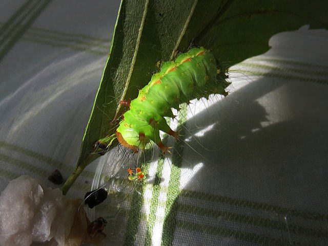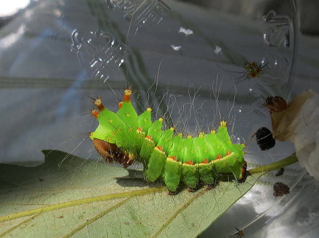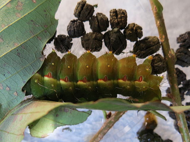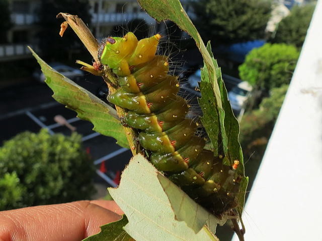 12.10.7 ヤバいよヤバいよ!と言いたくなるほどの大食漢… よく食うわ。 綺麗なコナラの葉が少なくなってきているので探すのが大変。 2個体は体長7pちょい、小さい1個体も6pほど。 大きい2個体は蛹化が近いのかな? 蛹化が近づくと、体色が変わるようなのでわかりやすい。 早く見たいような、もっと葉を食い続ける姿を見ていたいような… 終齢になって、音を立てて威嚇するようになった。 「カチッ カチッ」 って、押すタイプの使い捨てライターの音みたいな感じ。 長い毛の根元に小さく何本か棘があるけど、これを触るとちょっと痛い。 お食事中に失礼して大きい個体の一つを撮影。 |