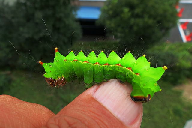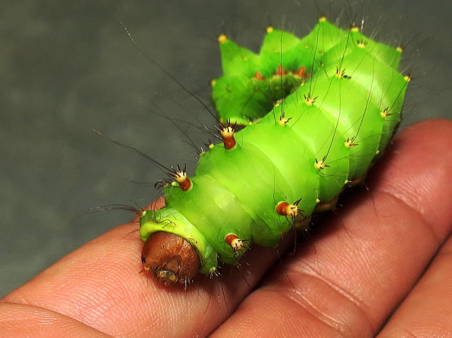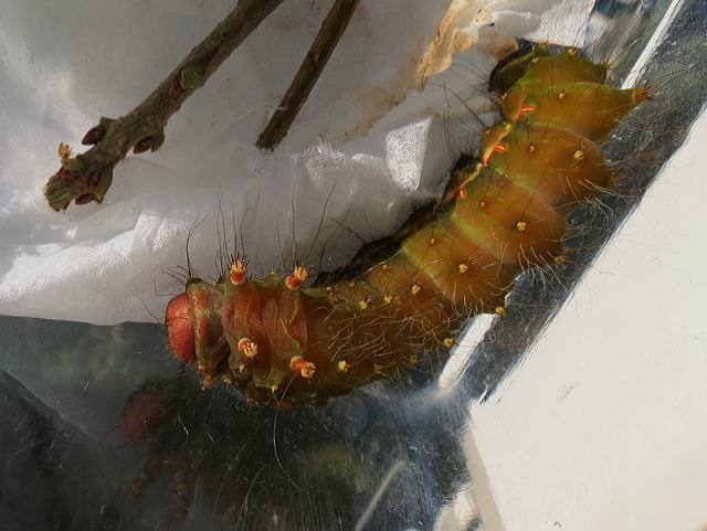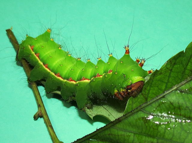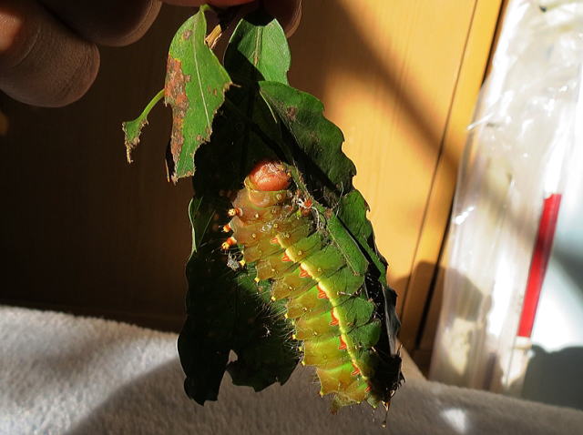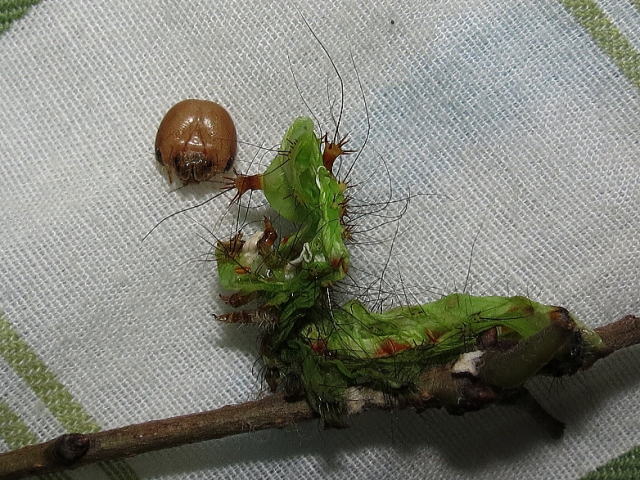 12.10.2 ネットで加齢の情報をいくつか見たけど、間違っていたのか勘違いしていたのか… オオミズアオは2齢で緑になるようだ。 初齢から2齢?としていたものは、5個体いたにもかかわらず脱皮した形跡がどれもなく、 頭部の大きさからも間違いないと思う。 なので、以前の記事は修正しておいた。 だって、今日2個体脱皮してたんだもん。 これで終齢幼虫だ。 |