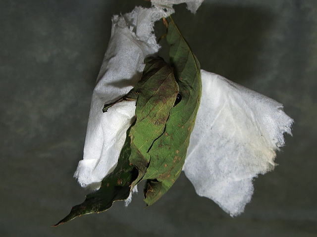 まともな葉が2枚しか付いていないので、応急と蛹の観察をしやすくしようとティッシュで代用。 しかし、ティッシュの部分が少ないので観察しづらそうかな… 下画像は夜。 もう完成しているようだ。 残り2個体は全て葉っぱと、ティッシュをメインに繭を作るようになってくれれば理想的だ。 |