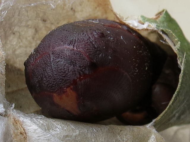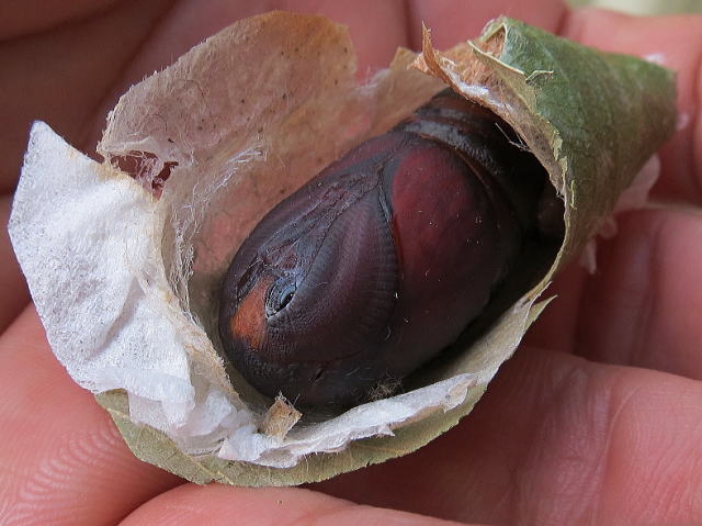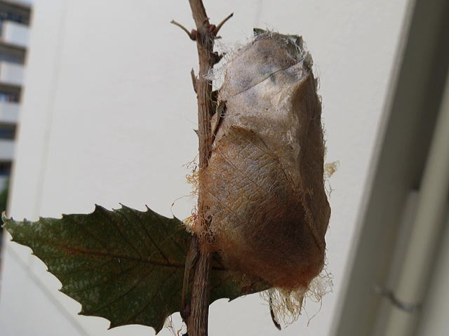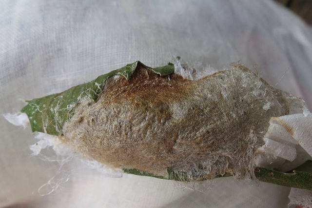 12.10.18 ティッシュの子は、なんかうまく葉を丸められ、その周りは頑丈に繭を作っている。 ハサミで切らないと観察できないかもしれないので、無理するかどうかはもうちょっとしてから考える。 中は見えないけど、とりあえず順調そうだ。 |