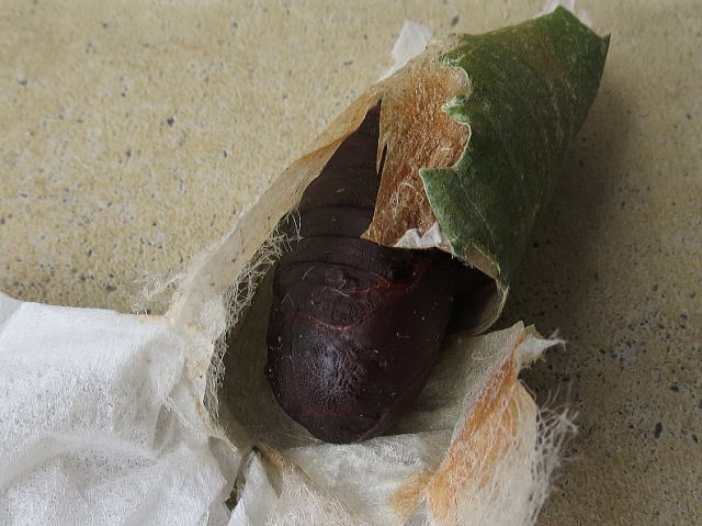 12.10.15 今朝、2個体とも変色していた。 1個体は葉っぱで、もう1個体は観察しやすいようにティッシュで繭を作ってもらう。 寂しくなるけど、無事に蛹化し、来春綺麗な姿を見せてほしい。 |