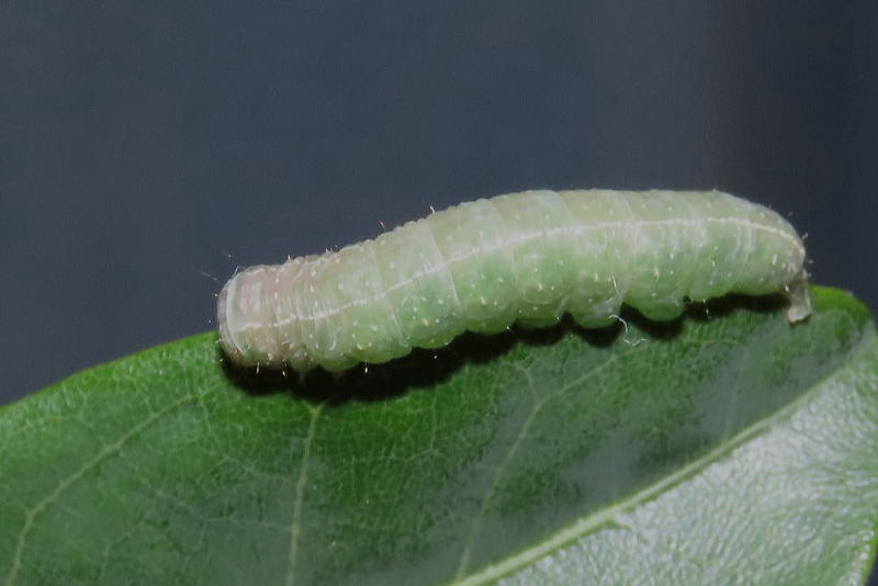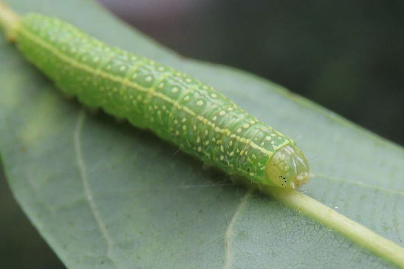 monroeさんの分もと追加を探したけど、小一時間見回るも見つからず… みっけにくい幼虫なのはわかっているけど、どこかにはいると思うんだけど… (たまたま本日、ご自身で発見されたそうです) 最後の方の木で、ぶら下がっている小さな幼虫がいた。 全く自信はないけど、なんとなく合ってるような気がしたのでこれも確保。 2齢くらいの幼虫だ。 |
