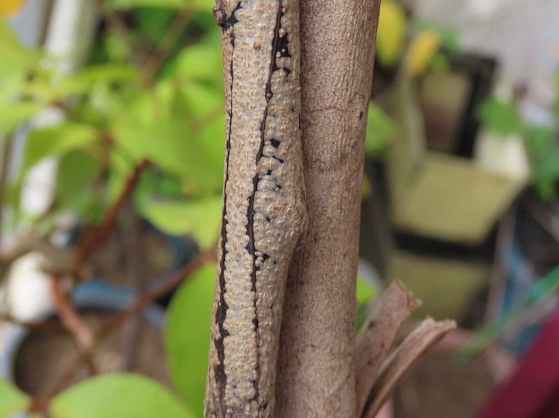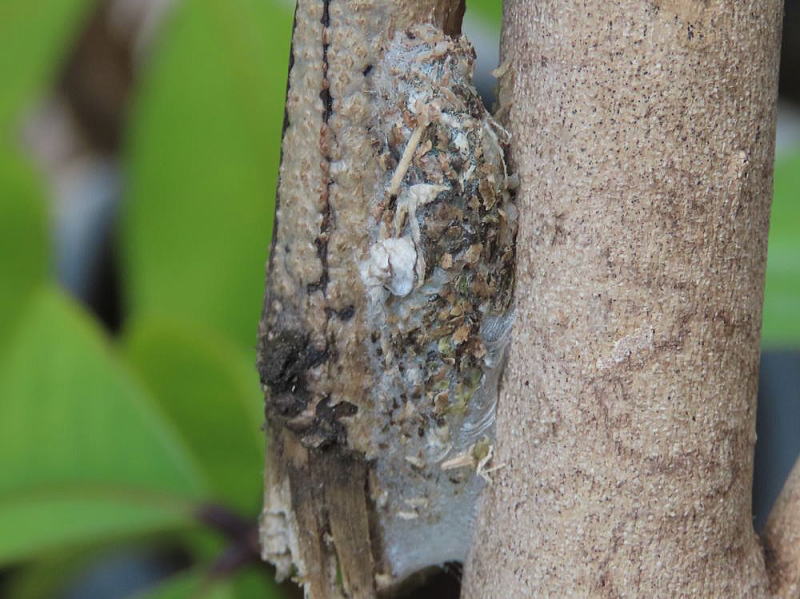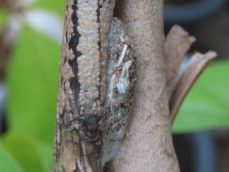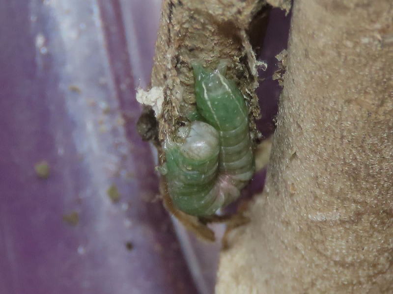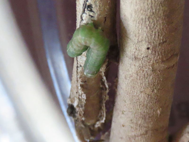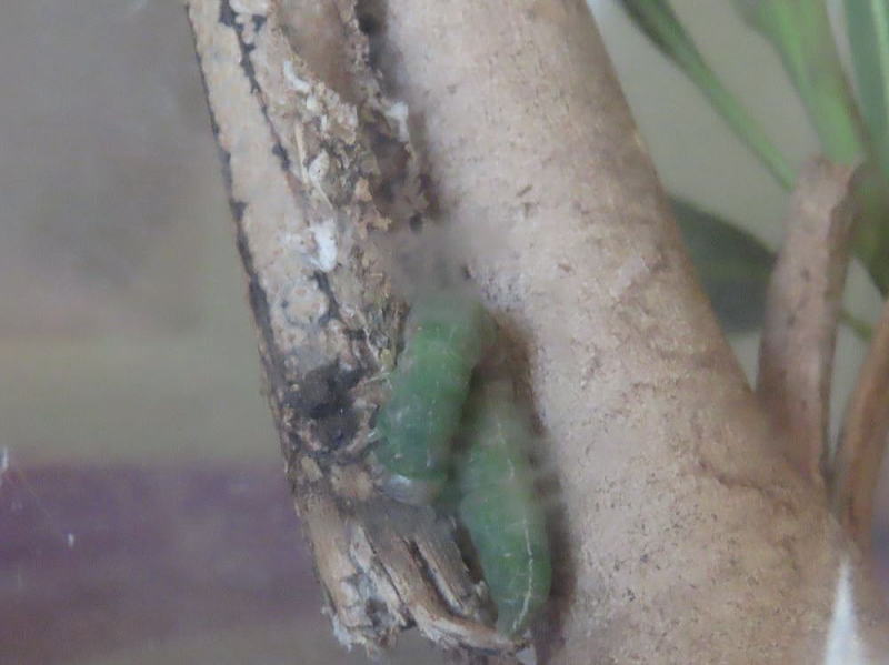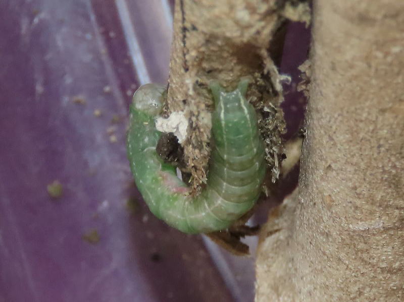 大きい方に変化が。 念のために短い枝を入れておいたが、ここに静止している。 ようやく繭作りに入るようだ。 撮影後、この枝は大きめの枝に括り付けて、木の皮を齧り取れるようにしておいた。 |