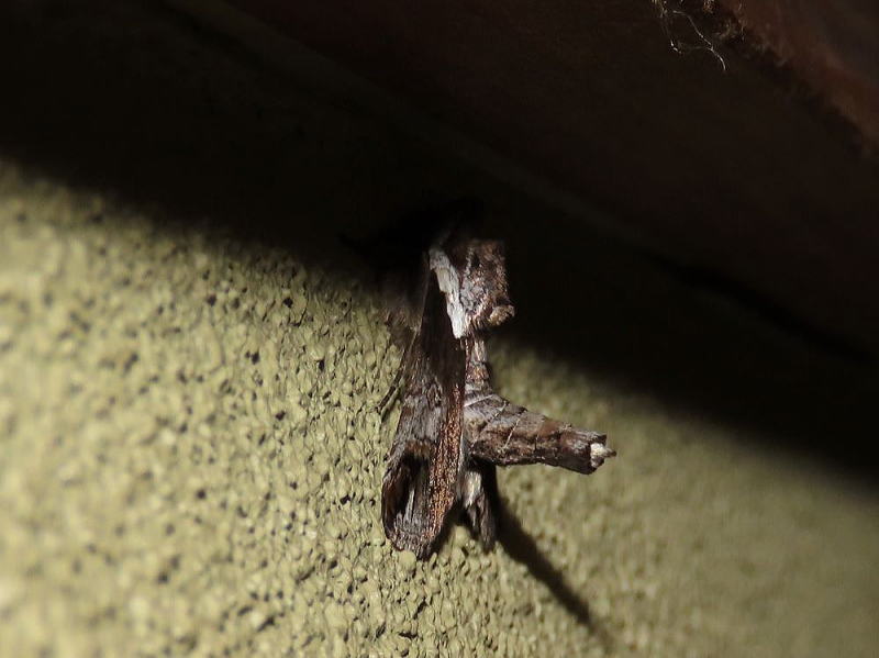 姿がなくご覧の通り。 二枚目が少し膨らんで見えるけど、元から膨らんでいたような… ここに繭があるなら、精巧すぎるだろ? 二本の枝を上でセロテープで止め、ガラス瓶に入れておいたので逃げ出せないと思うんだけど… 密閉容器に入れておくべきだった。 これが繭かもしれないし、部屋のどこかに脱走しちゃったのかもしれない。 脱走だとしたら、あまり動かないタイプだしピタっとするので見つからないかもしれない。 |
