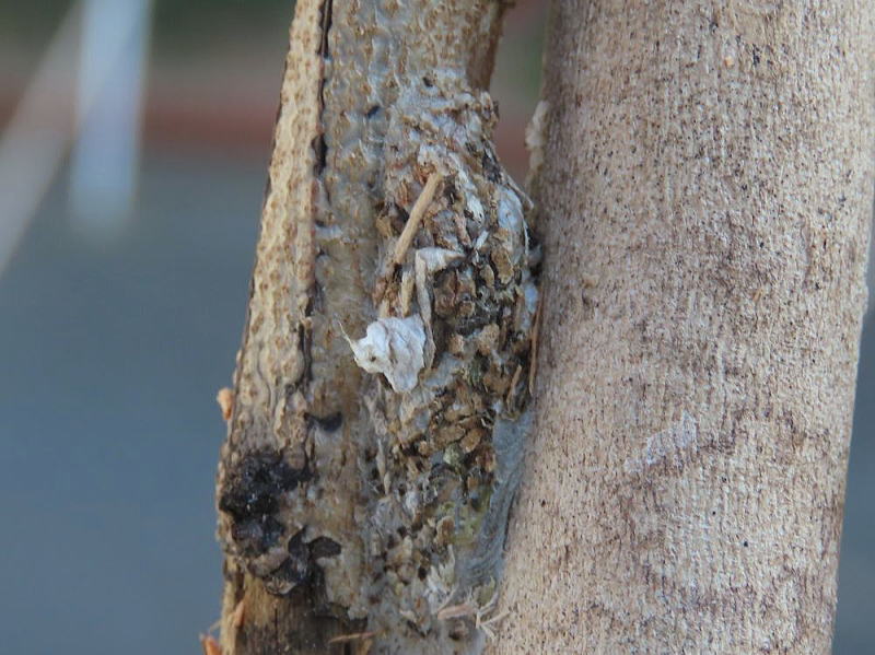 24.11.20 昨晩の早い時間には、繭は見た目的には完成していた。 うん、上手に作ったね。 シンジュキノカワガと比べちゃうと、擬態度はだいぶ甘いけどそれでも立派だ。 外で管理して、来春の羽化を楽しみにしたい。 そっとしておいて、今朝になって撮影した。 |