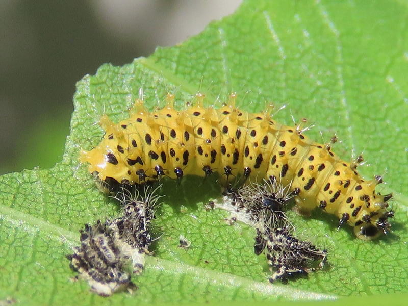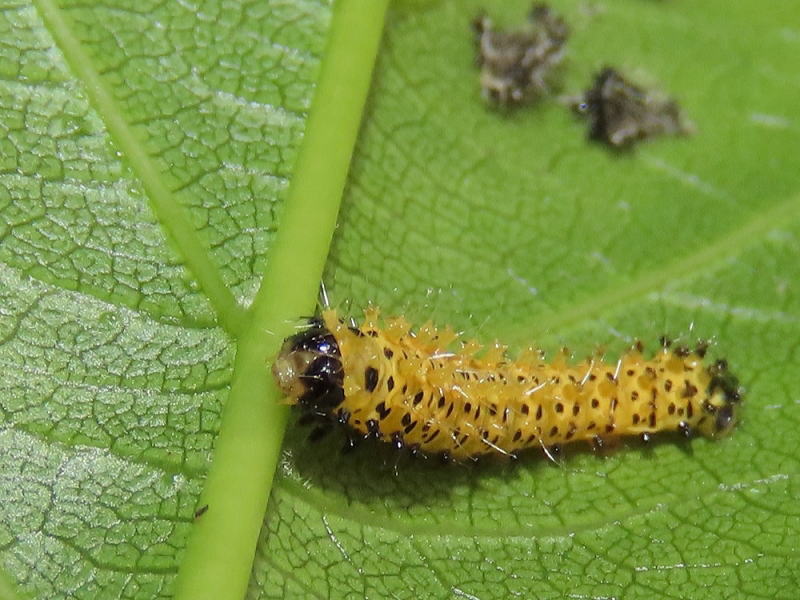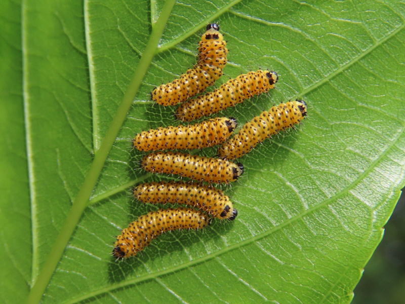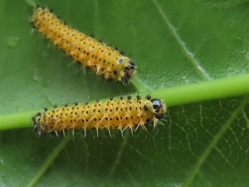| 26.4.24 21日、沖縄にてシンジュサンの幼虫を発見。 一昨年から幼虫がいたら確保してと頼まれていて、時間はかかったがようやく任務遂行できた。 初齢で脱皮間近といった雰囲気。 |