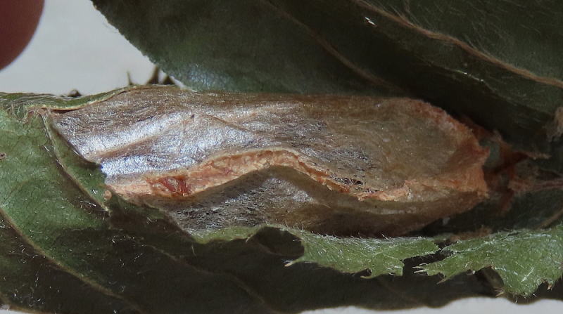 | 25.10.9 軽く葉を捲ってみた。 頑丈に繭を作っていた。 蛹を見たい気持ちを抑えて、このままそっとしておくことにする。 無事ならば、来春に元気な姿を見せてくれるだろう。 |