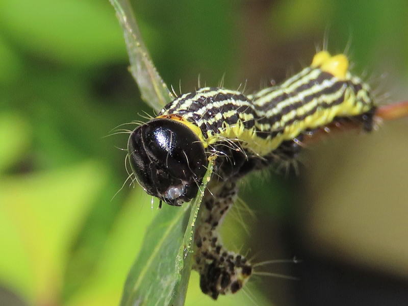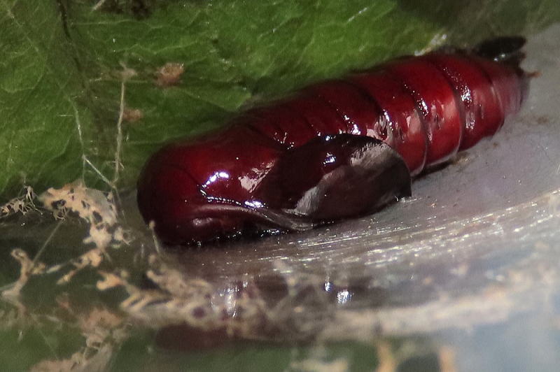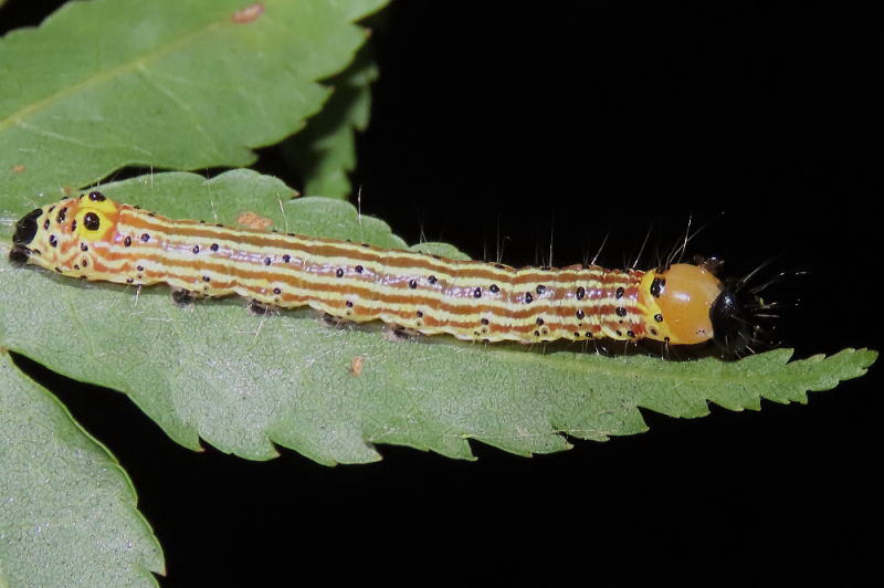 25.9.27 昨晩のmonroeさんとのナイターで、スジエグリシャチホコっ子を見つけていただいた。 終齢前の脱皮態勢だ。 帰宅すると、脱皮していた(2枚目)。 こうも色が変わるんか。 |
