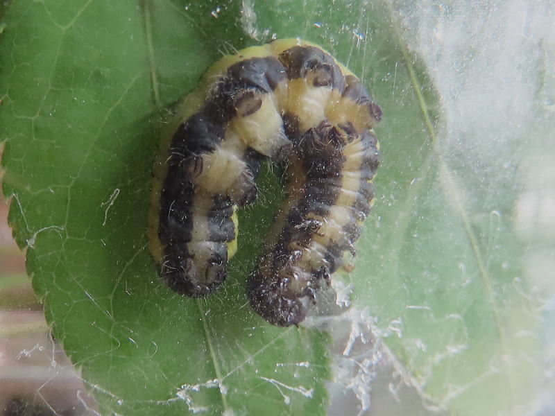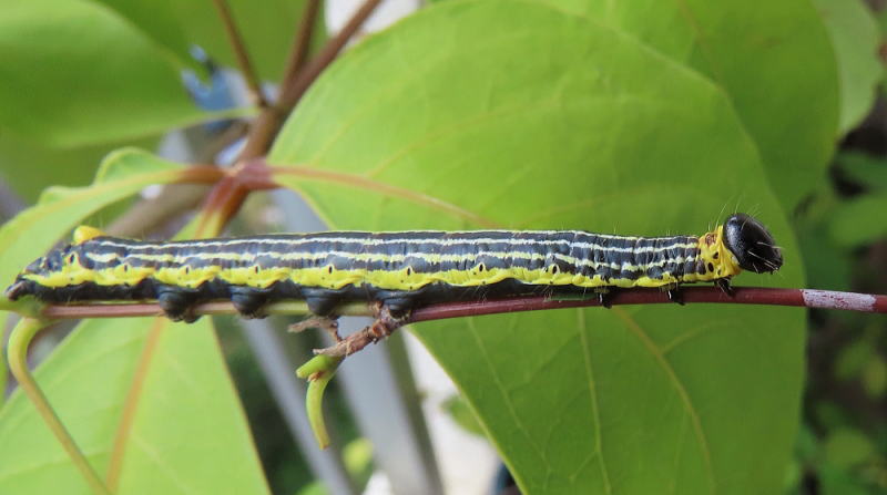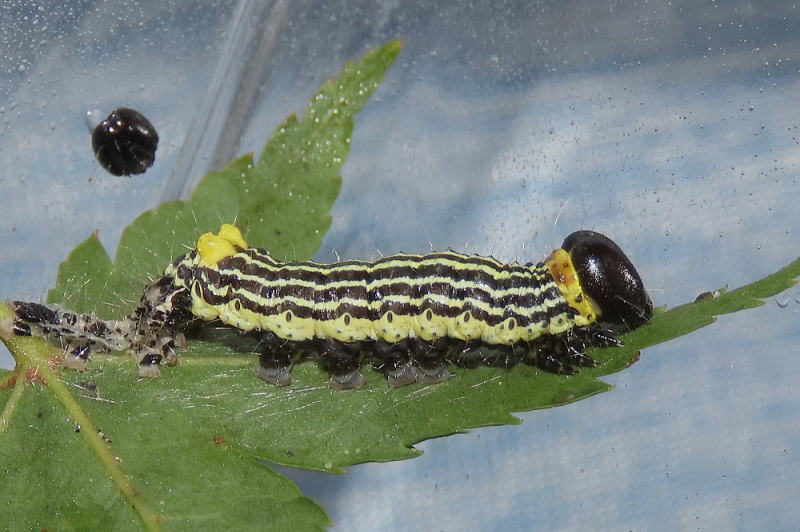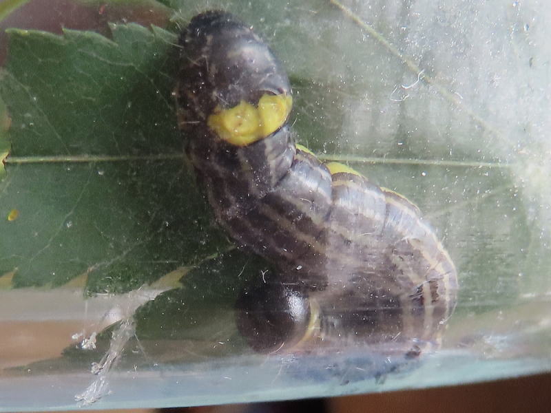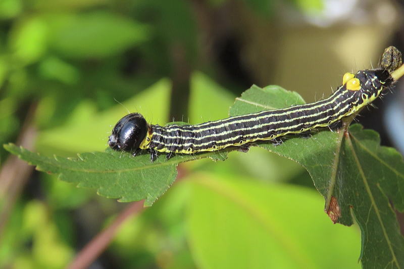 25.9.29 小さいけど終齢で、2個体いるからしょうがないんだけど、とにかく食いすぎ! 朝まで足りるだろうと思われる量の葉っぱ、余裕すぎるほどに入れておいても朝にはなくなってる。 ヤマモミジは家近にたくさんあるからいいんだけど、細い体なのにね〜。 |